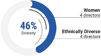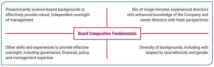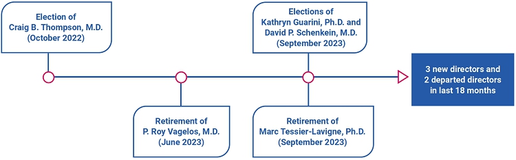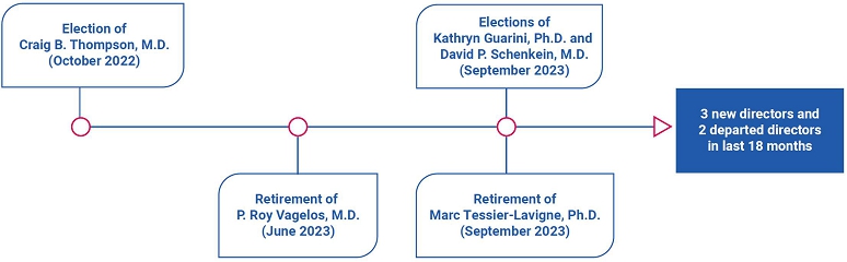 The board’s commitment to thoughtful director refreshment was recently demonstrated by the election of Drs. Kathryn Guarini and David Schenkein in September 2023 and Dr. Craig Thompson in October 2022. These additions reflect the board’s belief that the composition of Regeneron’s board should emphasize science-based backgrounds while comprising an overall mix of skills and experiences necessary to provide independent oversight of management. Our director search efforts also prioritized diversity considerations, which enabled us to deliver on the previously announced goal of increasing board gender diversity to over 30%.
