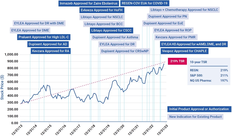 As we focus on helping patients, we have also delivered significant value to our shareholders. It was gratifying when, in early 2024, Regeneron first surpassed a $100 billion market capitalization, making us one of the few biotechnology companies to reach this valuation. We believe this milestone broadly reflects our ability to deliver on our mission, our track record of research and development (“R&D”) success, and our strong outlook for the future.