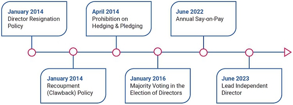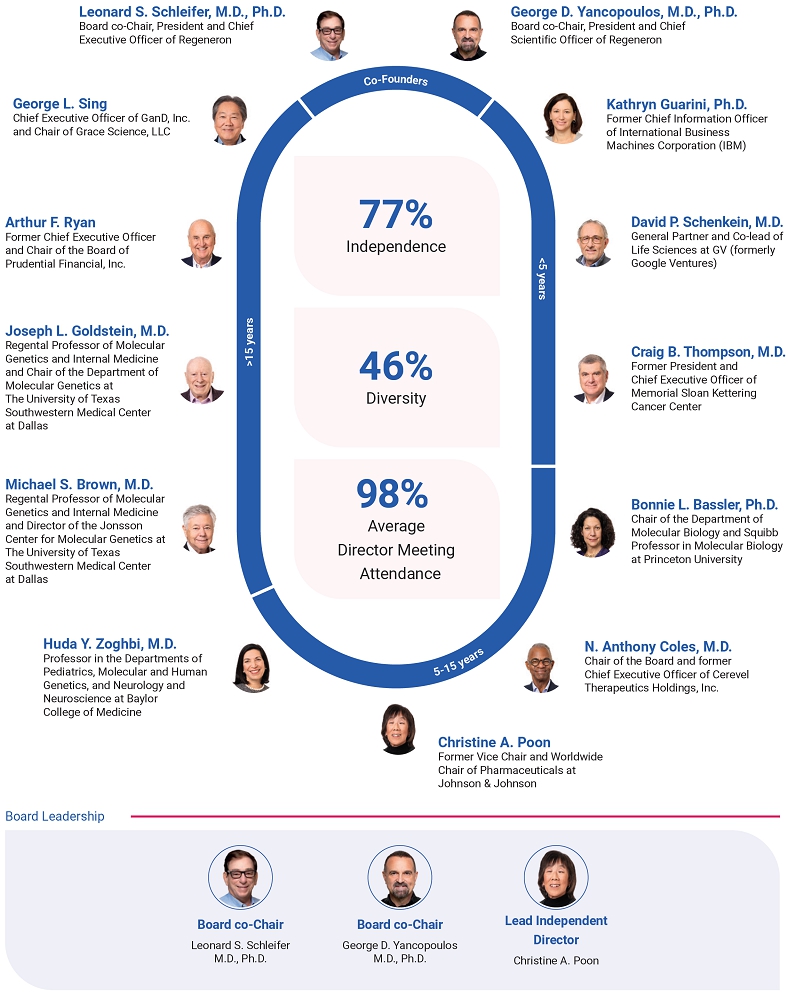 In June 2023, I was elected by my fellow independent directors to serve as Regeneron’s Lead Independent Director, a role created as part of Regeneron’s new governance framework designed to provide balanced board leadership. At the same time, the board appointed Drs. Leonard Schleifer and George Yancopoulos, who have led the Company for over 35 years, as co-Chairs of the board. Together with the other independent directors and the co-Chairs, I am committed to ensuring that the board is effective in fulfilling its fiduciary responsibilities and providing strong oversight of Regeneron. In this letter, I would like to discuss three important topics: the board’s approach to corporate governance, director refreshment and board diversity, and responsiveness to shareholder feedback.