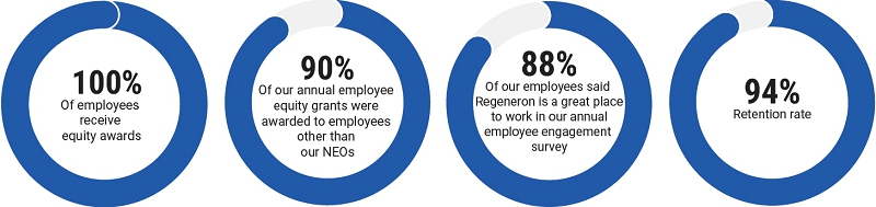 Our corporate responsibility strategy is intentionally and inextricably linked to our business strategy, focusing on improving the lives of people with serious diseases, fostering a culture of integrity and excellence, and building sustainable communities. In 2023, we made substantial progress towards our five-year responsibility goals, as demonstrated by our inclusion on the Dow Jones Sustainability World Index for the fifth consecutive year. This consistent ranking reflects our dedication to sustainability and highlights our belief that advancing environmental, social, and governance practices with a nexus to Regeneron’s operations is fundamental to the long-term resiliency and ethical foundation of both our business and society.