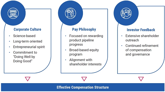 The board firmly believes that governance and compensation practices at Regeneron must be “fit for purpose” and aligned with the long-term outlook that is required to turn rigorous scientific research into important new medicines, the ultimate driver of sustainable, long-term value creation for Regeneron’s shareholders. Such practices must also serve to nurture Regeneron’s unique culture, which we discuss in greater detail in the accompanying proxy statement. As Regeneron grows, our governance and compensation practices must evolve with these objectives as our anchor. The board’s decision to establish a Lead Independent Director function is an example of how the board considers shareholder feedback and adjusts Regeneron’s corporate governance.