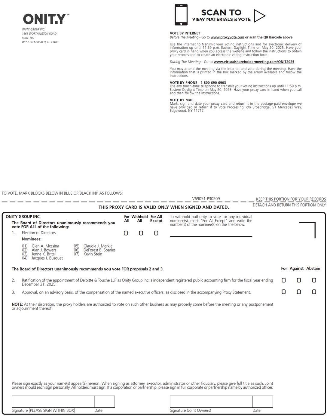 On behalf of the Board of Directors, I cordially invite you to participate in the Annual Meeting of Shareholders of Onity Group Inc., which will be held on Wednesday, May 21, 2025, at 9:00 a.m., Eastern Daylight Time. Our experience continues to demonstrate that virtual-format shareholder meetings allow more shareholders to participate online than would be able to travel to the meeting to attend in person, so we will again be hosting this year’s Annual Meeting in a virtual format only via live audiocast on the Internet at www.virtualshareholdermeeting.com/ONIT2025. To participate, vote or submit questions during the Annual Meeting via live audiocast, please review the detailed procedures included in our Notice of Annual Meeting. You will not be able to attend the Annual Meeting physically in person. For purposes of attendance at the Annual Meeting, all references herein to “present,” “participate,” or “in person,” shall mean virtually present at the Annual Meeting.
