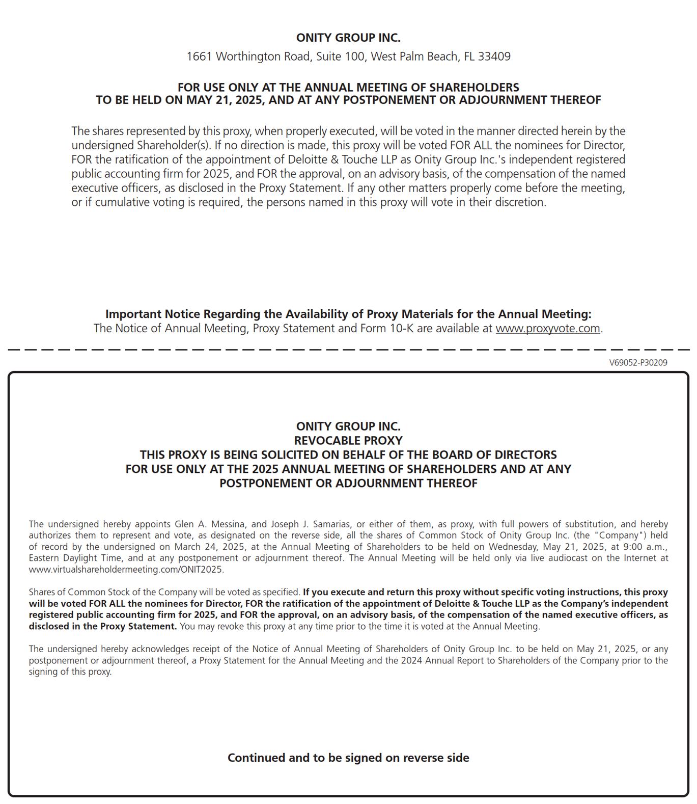 | ● | If you would like to attend the virtual meeting and you have your control number, please go to www.virtualshareholdermeeting.com/ONIT2025 15 minutes prior to the start of the meeting to log in. For shareholders who hold shares in street name, if you came through your brokerage firm’s website and do not have your control number, you can gain access to the meeting by logging into your brokerage firm’s website 15 minutes prior to the meeting start, selecting the shareholder communications mailbox to link through to the meeting and the control number will automatically populate. For technical assistance when logging into Onity’s Annual Meeting, please call 800-586-1548 (US) or 303-562-9288 (International). | |