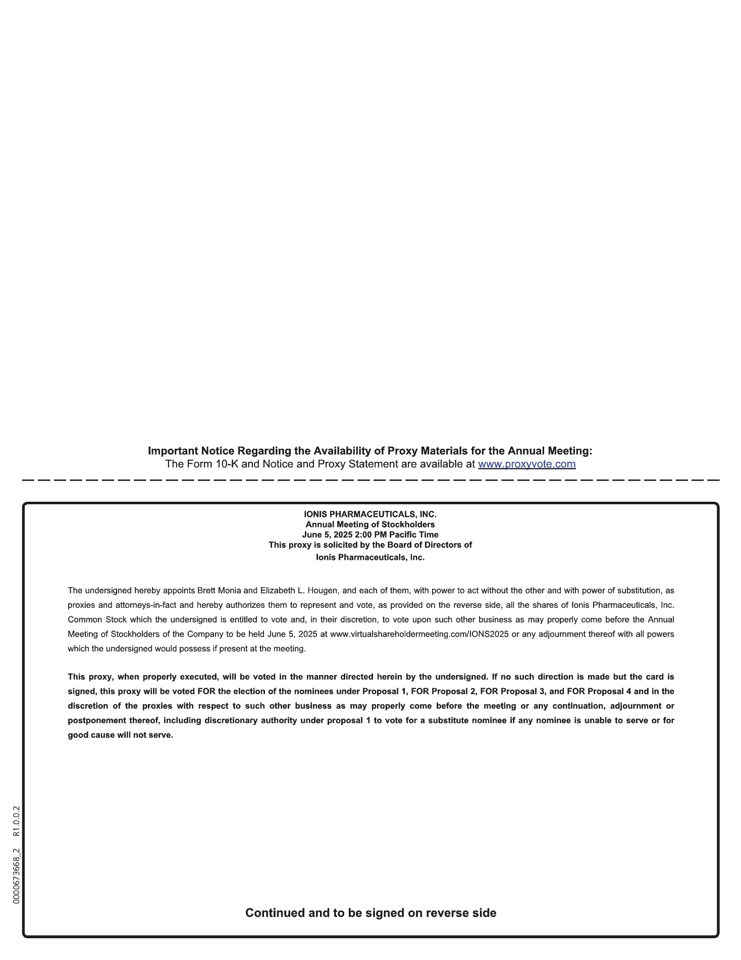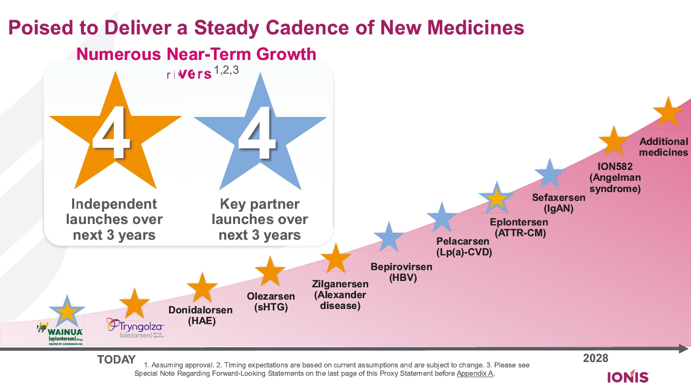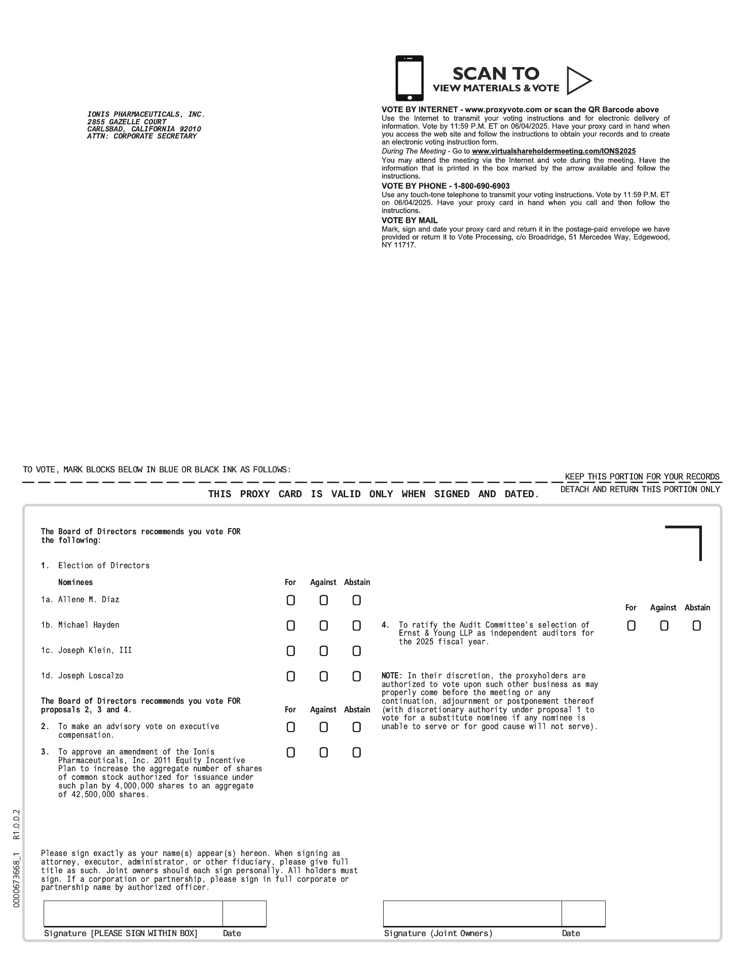 Michael Hayden, CM, OBC, MB, ChB, Ph.D., FRCP(C), FRSC, age 73, has served as a director of Ionis since September 2018. Dr. Hayden has been Chief Executive Officer and director of Prilenia Therapeutics, a private clinical stage biotech company, since September 2018. Dr. Hayden is also a Killam Professor at the University of British Columbia (“UBC”), the highest honor UBC can confer on any faculty member. In addition, he is an accomplished scientist and physician. He was the President of Global R&D and Chief Scientific Officer at Teva Pharmaceuticals from 2012 to 2017. During this time approximately 35 new products were approved in major markets with many for diseases of the central nervous system. In 2015 Teva R&D was recognized as one of the 100 most exciting innovators in the pharmaceutical industry by IDEA Pharma, and in 2017 Teva R&D ranked top of the industry for central nervous system development and clinical trial success rate by Pharma Intelligence. Dr. Hayden has founded five biotechnology companies and has been the recipient of numerous prestigious honors and awards, including being inducted into the Canadian Medical Hall of Fame and receiving the July 2012 Diamond Jubilee Medal on behalf of HRH Queen Elisabeth II. He has also received the Canada Gairdner Wightman Award. Dr. Hayden was awarded the Order of Canada, the Order of British Columbia, named Canada’s Health Researcher of the Year by Canadian Institutes of Health Research, and received the Prix Galien Award in 2007. Dr. Hayden has also been awarded honorary degrees of science and medicine from the University of Alberta in 2009, University Gottingen in 2014, and University of Cape Town in 2023. Dr. Hayden served on the board of Aurinia Pharmaceuticals, Inc. until August 2021, Xenon Pharmaceuticals until June 2022, and Oxford Biomedica until June 2024. Dr. Hayden currently serves on the boards of 89Bio and AbCellera Biologics.