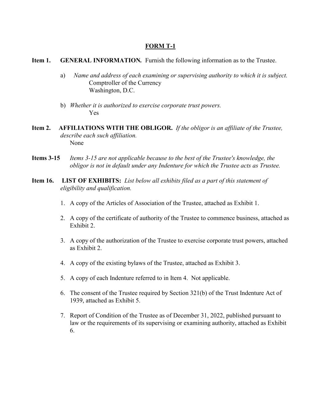 #101209185v1 FORM T-1 Item 1. GENERAL INFORMATION. Furnish the following information as to the Trustee. a) Name and address of each examining or supervising authority to which it is subject. Comptroller of the Currency Washington, D.C. b) Whether it is authorized to exercise corporate trust powers. Yes Item 2. AFFILIATIONS WITH THE OBLIGOR. If the obligor is an affiliate of the Trustee, describe each such affiliation. None Items 3-15 Items 3-15 are not applicable because to the best of the Trustee's knowledge, the obligor is not in default under any Indenture for which the Trustee acts as Trustee. Item 16. LIST OF EXHIBITS: List below all exhibits filed as a part of this statement of eligibility and qualification. 1. A copy of the Articles of Association of the Trustee, attached as Exhibit 1. 2. A copy of the certificate of authority of the Trustee to commence business, attached as Exhibit 2. 3. A copy of the authorization of the Trustee to exercise corporate trust powers, attached as Exhibit 2. 4. A copy of the existing bylaws of the Trustee, attached as Exhibit 3. 5. A copy of each Indenture referred to in Item 4. Not applicable. 6. The consent of the Trustee required by Section 321(b) of the Trust Indenture Act of 1939, attached as Exhibit 5. 7. Report of Condition of the Trustee as of December 31, 2022, published pursuant to law or the requirements of its supervising or examining authority, attached as Exhibit 6.