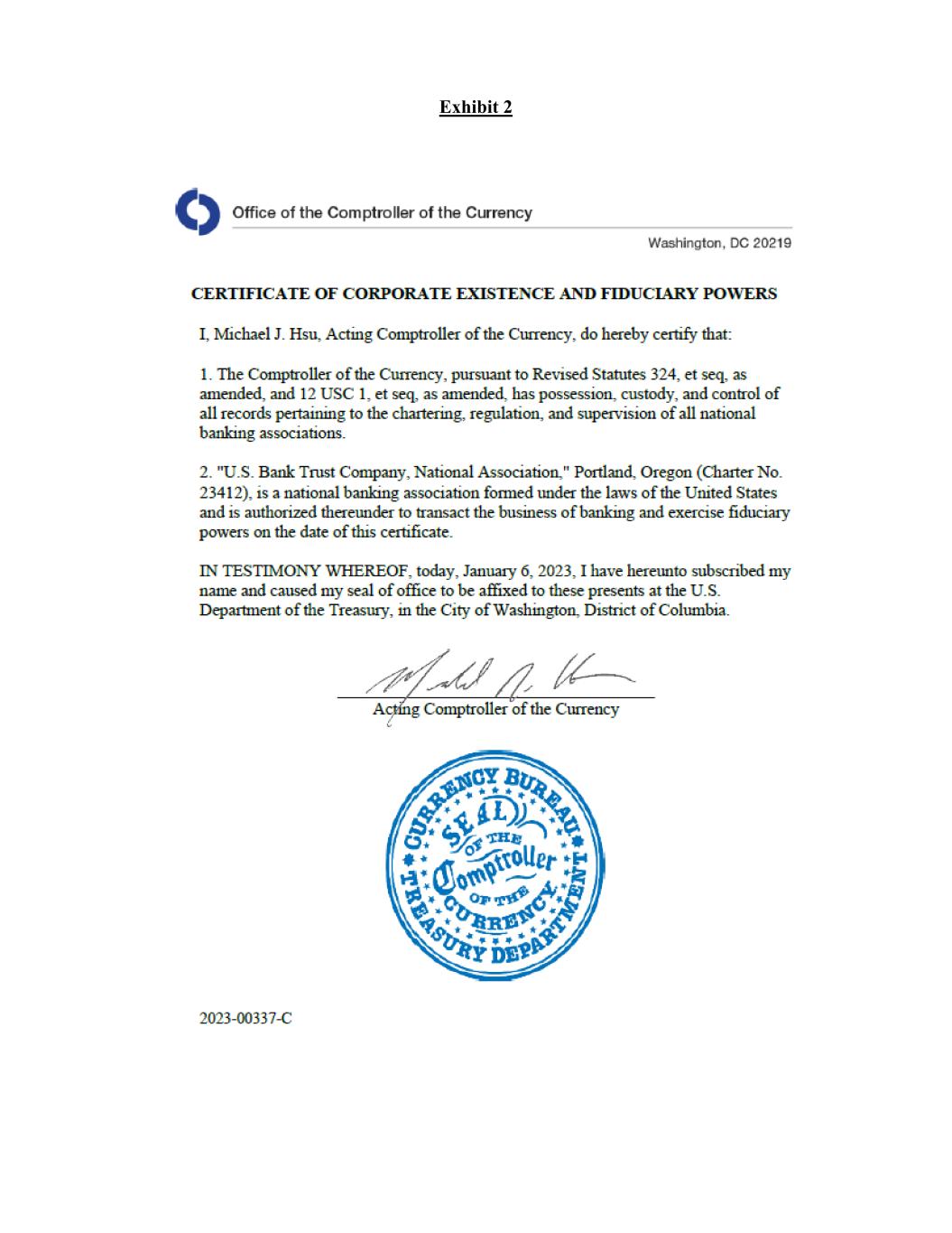 #101209185v1 Exhibit 1 ARTICLES OF ASSOCIATION OF U. S. BANK TRUST COMPANY, NATIONAL ASSOCIATION For the purpose of organizing an association (the “Association”) to perform any lawful activities of national banks, the undersigned enter into the following Articles of Association: FIRST. The title of this Association shall be U. S. Bank Trust Company, National Association. SECOND. The main office of the Association shall be in the city of Portland, county of Multnomah, state of Oregon. The business of the Association will be limited to fiduciary powers and the support of activities incidental to the exercise of those powers. The Association may not expand or alter its business beyond that stated in this article without the prior approval of the Comptroller of the Currency. THIRD. The board of directors of the Association shall consist of not less than five nor more than twenty-five persons, the exact number to be fixed and determined from time to time by resolution of a majority of the full board of directors or by resolution of a majority of the shareholders at any annual or special meeting thereof. Each director shall own common or preferred stock of the Association or of a holding company owning the Association, with an aggregate par, fair market, or equity value of not less than $1,000, as of either (i) the date of purchase, (ii) the date the person became a director, or (iii) the date of that person's most recent election to the board of directors, whichever is more recent. Any combination of common or preferred stock of the Association or holding company may be used. Any vacancy in the board of directors may be filled by action of a majority of the remaining directors between meetings of shareholders. The board of directors may increase the number of directors up to the maximum permitted by law. Terms of directors, including directors selected to fill vacancies, shall expire at the next regular meeting of shareholders at which directors are elected, unless the directors resign or are removed from office. Despite the expiration of a director's term, the director shall continue to serve until his or her successor is elected and qualified or until there is a decrease in the number of directors and his or her position is eliminated. Honorary or advisory members of the board of directors, without voting power or power of final decision in matters concerning the business of the Association, may be appointed by resolution of a majority of the full board of directors, or by resolution of shareholders at any annual or special meeting. Honorary or advisory directors shall not be counted to determined the number of directors of the Association or the presence of a quorum in connection with any board action, and shall not be required to own qualifying shares. FOURTH. There shall be an annual meeting of the shareholders to elect directors and transact whatever other business may be brought before the meeting. It shall be held at the main office or any other convenient place the board of directors may designate, on the day of each year specified therefor in the Bylaws, or if that day falls on a legal holiday in the state in which the - 1 -