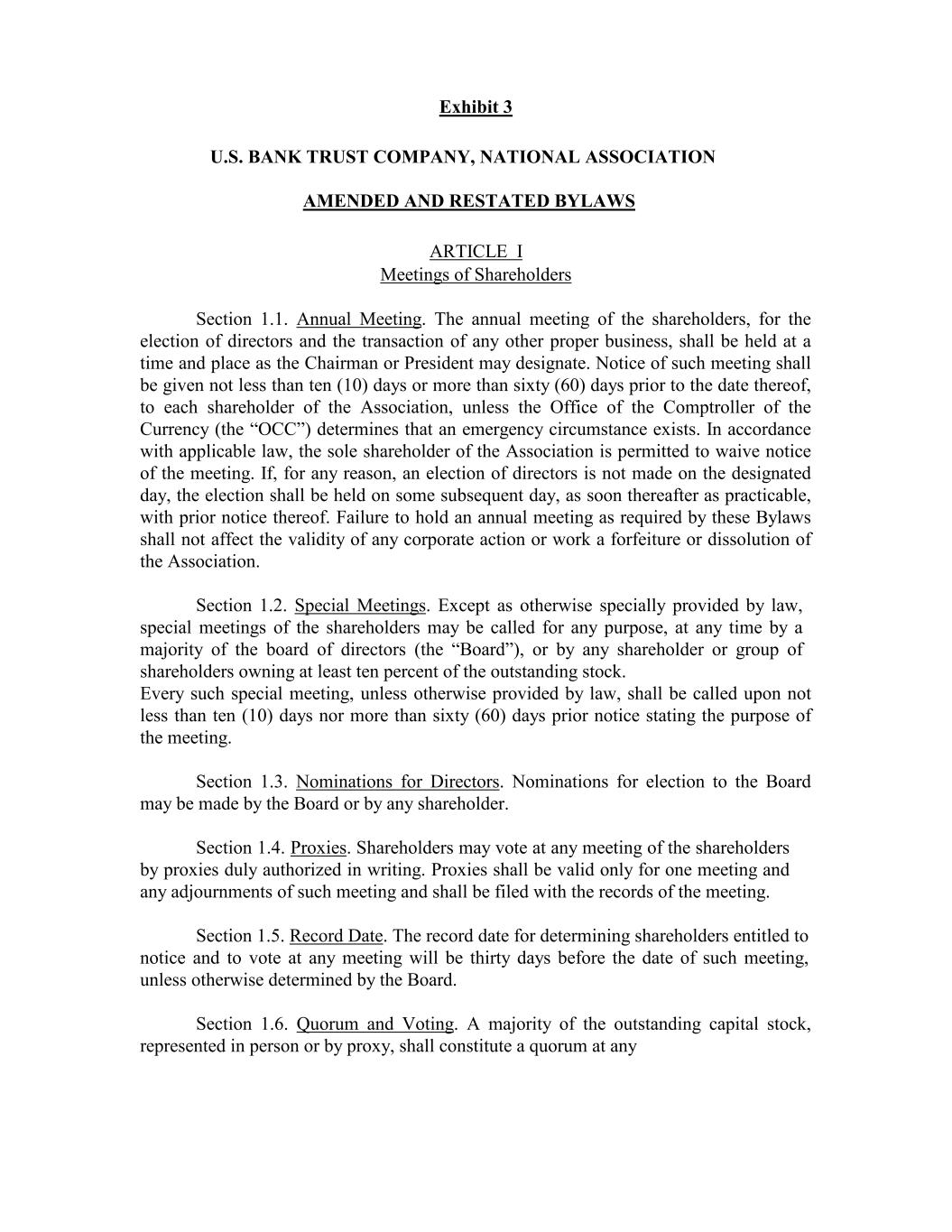 #101209185v1 Exhibit 3 U.S. BANK TRUST COMPANY, NATIONAL ASSOCIATION AMENDED AND RESTATED BYLAWS ARTICLE I Meetings of Shareholders Section 1.1. Annual Meeting. The annual meeting of the shareholders, for the election of directors and the transaction of any other proper business, shall be held at a time and place as the Chairman or President may designate. Notice of such meeting shall be given not less than ten (10) days or more than sixty (60) days prior to the date thereof, to each shareholder of the Association, unless the Office of the Comptroller of the Currency (the “OCC”) determines that an emergency circumstance exists. In accordance with applicable law, the sole shareholder of the Association is permitted to waive notice of the meeting. If, for any reason, an election of directors is not made on the designated day, the election shall be held on some subsequent day, as soon thereafter as practicable, with prior notice thereof. Failure to hold an annual meeting as required by these Bylaws shall not affect the validity of any corporate action or work a forfeiture or dissolution of the Association. Section 1.2. Special Meetings. Except as otherwise specially provided by law, special meetings of the shareholders may be called for any purpose, at any time by a majority of the board of directors (the “Board”), or by any shareholder or group of shareholders owning at least ten percent of the outstanding stock. Every such special meeting, unless otherwise provided by law, shall be called upon not less than ten (10) days nor more than sixty (60) days prior notice stating the purpose of the meeting. Section 1.3. Nominations for Directors. Nominations for election to the Board may be made by the Board or by any shareholder. Section 1.4. Proxies. Shareholders may vote at any meeting of the shareholders by proxies duly authorized in writing. Proxies shall be valid only for one meeting and any adjournments of such meeting and shall be filed with the records of the meeting. Section 1.5. Record Date. The record date for determining shareholders entitled to notice and to vote at any meeting will be thirty days before the date of such meeting, unless otherwise determined by the Board. Section 1.6. Quorum and Voting. A majority of the outstanding capital stock, represented in person or by proxy, shall constitute a quorum at any