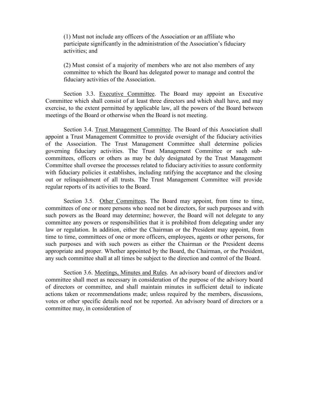 (1) Must not include any officers of the Association or an affiliate who participate significantly in the administration of the Association’s fiduciary activities; and (2) Must consist of a majority of members who are not also members of any committee to which the Board has delegated power to manage and control the fiduciary activities of the Association. Section 3.3. Executive Committee. The Board may appoint an Executive Committee which shall consist of at least three directors and which shall have, and may exercise, to the extent permitted by applicable law, all the powers of the Board between meetings of the Board or otherwise when the Board is not meeting. Section 3.4. Trust Management Committee. The Board of this Association shall appoint a Trust Management Committee to provide oversight of the fiduciary activities of the Association. The Trust Management Committee shall determine policies governing fiduciary activities. The Trust Management Committee or such sub- committees, officers or others as may be duly designated by the Trust Management Committee shall oversee the processes related to fiduciary activities to assure conformity with fiduciary policies it establishes, including ratifying the acceptance and the closing out or relinquishment of all trusts. The Trust Management Committee will provide regular reports of its activities to the Board. Section 3.5. Other Committees. The Board may appoint, from time to time, committees of one or more persons who need not be directors, for such purposes and with such powers as the Board may determine; however, the Board will not delegate to any committee any powers or responsibilities that it is prohibited from delegating under any law or regulation. In addition, either the Chairman or the President may appoint, from time to time, committees of one or more officers, employees, agents or other persons, for such purposes and with such powers as either the Chairman or the President deems appropriate and proper. Whether appointed by the Board, the Chairman, or the President, any such committee shall at all times be subject to the direction and control of the Board. Section 3.6. Meetings, Minutes and Rules. An advisory board of directors and/or committee shall meet as necessary in consideration of the purpose of the advisory board of directors or committee, and shall maintain minutes in sufficient detail to indicate actions taken or recommendations made; unless required by the members, discussions, votes or other specific details need not be reported. An advisory board of directors or a committee may, in consideration of