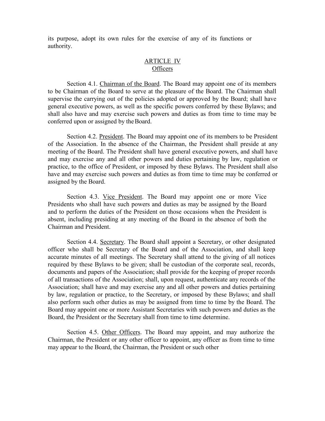 its purpose, adopt its own rules for the exercise of any of its functions or authority. ARTICLE IV Officers Section 4.1. Chairman of the Board. The Board may appoint one of its members to be Chairman of the Board to serve at the pleasure of the Board. The Chairman shall supervise the carrying out of the policies adopted or approved by the Board; shall have general executive powers, as well as the specific powers conferred by these Bylaws; and shall also have and may exercise such powers and duties as from time to time may be conferred upon or assigned by the Board. Section 4.2. President. The Board may appoint one of its members to be President of the Association. In the absence of the Chairman, the President shall preside at any meeting of the Board. The President shall have general executive powers, and shall have and may exercise any and all other powers and duties pertaining by law, regulation or practice, to the office of President, or imposed by these Bylaws. The President shall also have and may exercise such powers and duties as from time to time may be conferred or assigned by the Board. Section 4.3. Vice President. The Board may appoint one or more Vice Presidents who shall have such powers and duties as may be assigned by the Board and to perform the duties of the President on those occasions when the President is absent, including presiding at any meeting of the Board in the absence of both the Chairman and President. Section 4.4. Secretary. The Board shall appoint a Secretary, or other designated officer who shall be Secretary of the Board and of the Association, and shall keep accurate minutes of all meetings. The Secretary shall attend to the giving of all notices required by these Bylaws to be given; shall be custodian of the corporate seal, records, documents and papers of the Association; shall provide for the keeping of proper records of all transactions of the Association; shall, upon request, authenticate any records of the Association; shall have and may exercise any and all other powers and duties pertaining by law, regulation or practice, to the Secretary, or imposed by these Bylaws; and shall also perform such other duties as may be assigned from time to time by the Board. The Board may appoint one or more Assistant Secretaries with such powers and duties as the Board, the President or the Secretary shall from time to time determine. Section 4.5. Other Officers. The Board may appoint, and may authorize the Chairman, the President or any other officer to appoint, any officer as from time to time may appear to the Board, the Chairman, the President or such other