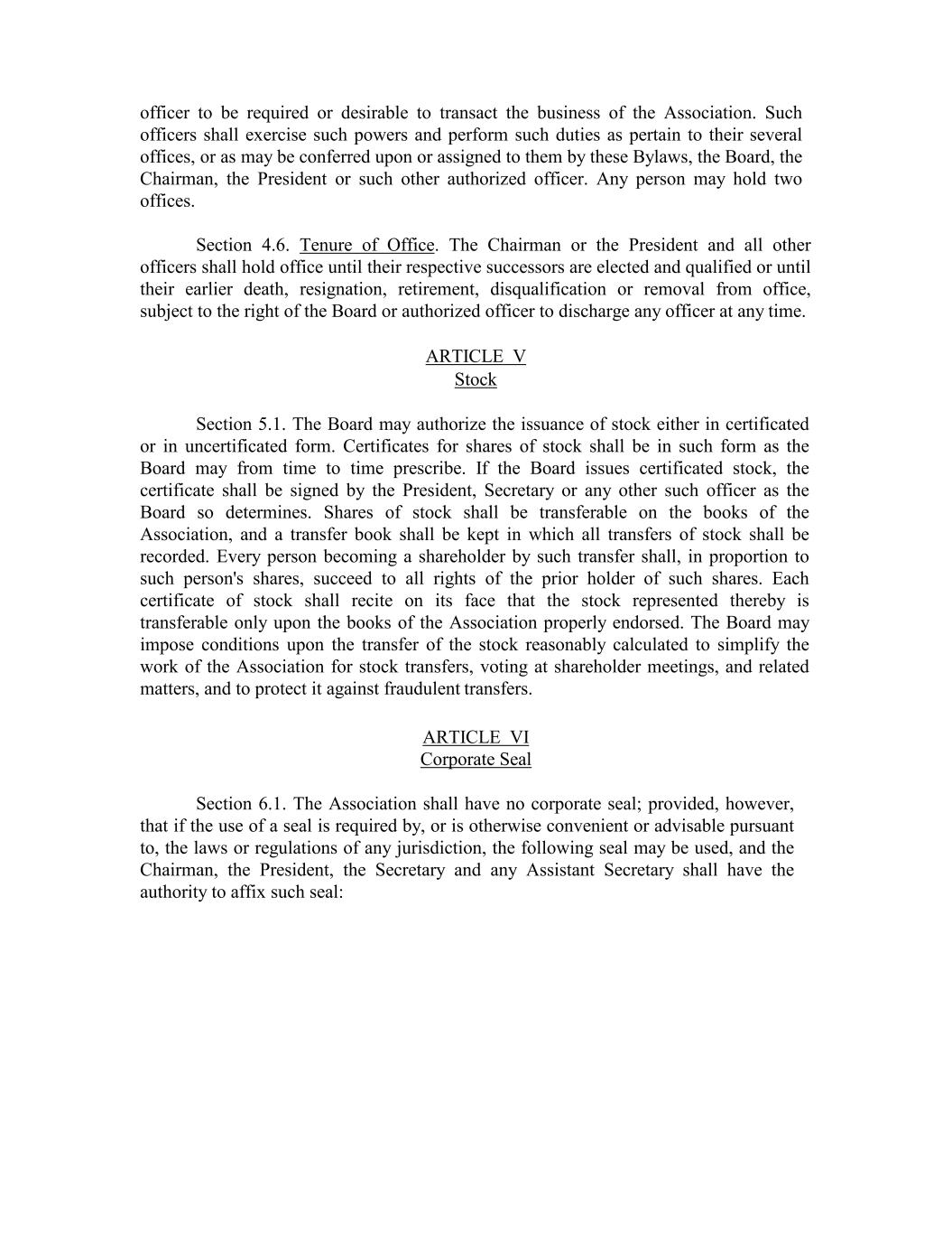 officer to be required or desirable to transact the business of the Association. Such officers shall exercise such powers and perform such duties as pertain to their several offices, or as may be conferred upon or assigned to them by these Bylaws, the Board, the Chairman, the President or such other authorized officer. Any person may hold two offices. Section 4.6. Tenure of Office. The Chairman or the President and all other officers shall hold office until their respective successors are elected and qualified or until their earlier death, resignation, retirement, disqualification or removal from office, subject to the right of the Board or authorized officer to discharge any officer at any time. ARTICLE V Stock Section 5.1. The Board may authorize the issuance of stock either in certificated or in uncertificated form. Certificates for shares of stock shall be in such form as the Board may from time to time prescribe. If the Board issues certificated stock, the certificate shall be signed by the President, Secretary or any other such officer as the Board so determines. Shares of stock shall be transferable on the books of the Association, and a transfer book shall be kept in which all transfers of stock shall be recorded. Every person becoming a shareholder by such transfer shall, in proportion to such person's shares, succeed to all rights of the prior holder of such shares. Each certificate of stock shall recite on its face that the stock represented thereby is transferable only upon the books of the Association properly endorsed. The Board may impose conditions upon the transfer of the stock reasonably calculated to simplify the work of the Association for stock transfers, voting at shareholder meetings, and related matters, and to protect it against fraudulent transfers. ARTICLE VI Corporate Seal Section 6.1. The Association shall have no corporate seal; provided, however, that if the use of a seal is required by, or is otherwise convenient or advisable pursuant to, the laws or regulations of any jurisdiction, the following seal may be used, and the Chairman, the President, the Secretary and any Assistant Secretary shall have the authority to affix such seal: