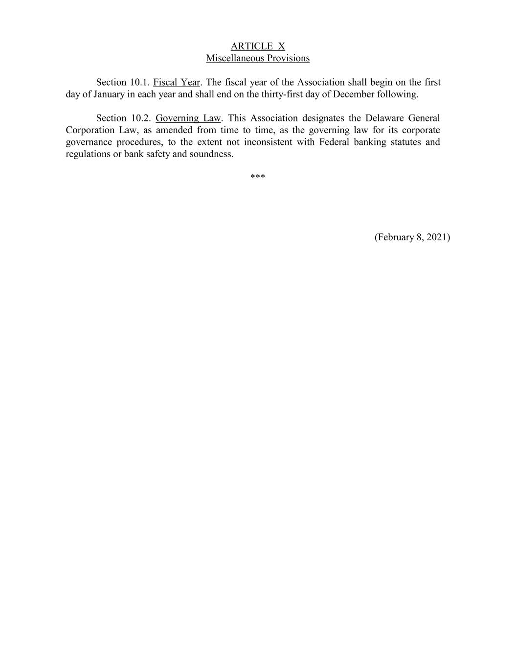 ARTICLE X Miscellaneous Provisions Section 10.1. Fiscal Year. The fiscal year of the Association shall begin on the first day of January in each year and shall end on the thirty-first day of December following. Section 10.2. Governing Law. This Association designates the Delaware General Corporation Law, as amended from time to time, as the governing law for its corporate governance procedures, to the extent not inconsistent with Federal banking statutes and regulations or bank safety and soundness. *** (February 8, 2021)