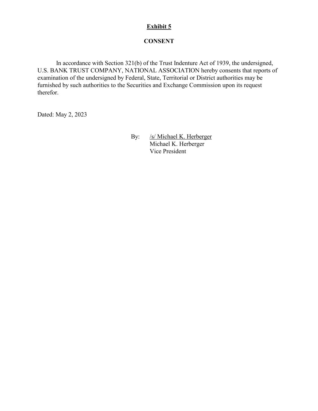 #101209185v1 Exhibit 5 CONSENT In accordance with Section 321(b) of the Trust Indenture Act of 1939, the undersigned, U.S. BANK TRUST COMPANY, NATIONAL ASSOCIATION hereby consents that reports of examination of the undersigned by Federal, State, Territorial or District authorities may be furnished by such authorities to the Securities and Exchange Commission upon its request therefor. Dated: May 2, 2023 By: /s/ Michael K. Herberger Michael K. Herberger Vice President