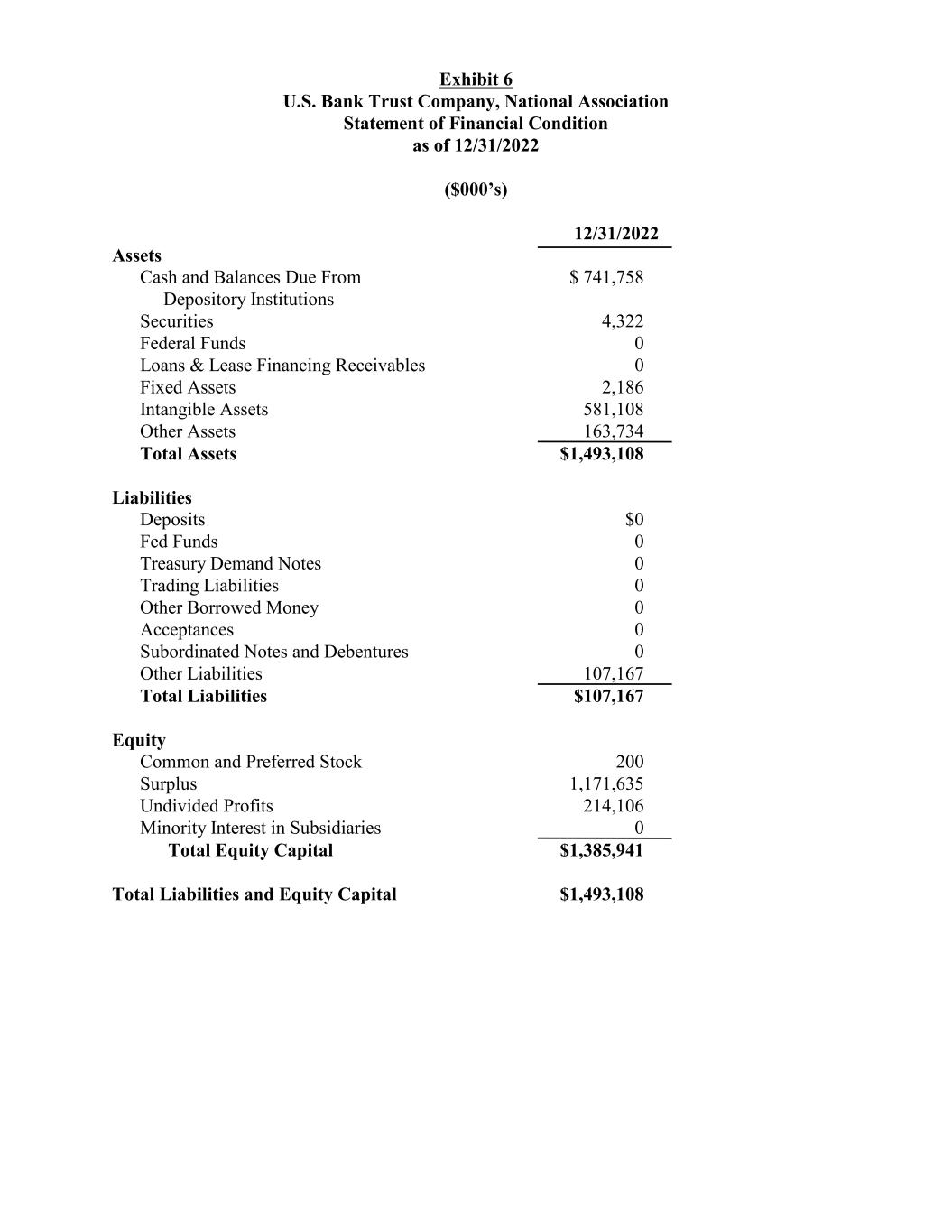 #101209185v1 Exhibit 6 U.S. Bank Trust Company, National Association Statement of Financial Condition as of 12/31/2022 ($000’s) 12/31/2022 Assets Cash and Balances Due From $ 741,758 Depository Institutions Securities 4,322 Federal Funds 0 Loans & Lease Financing Receivables 0 Fixed Assets 2,186 Intangible Assets 581,108 Other Assets 163,734 Total Assets $1,493,108 Liabilities Deposits $0 Fed Funds 0 Treasury Demand Notes 0 Trading Liabilities 0 Other Borrowed Money 0 Acceptances 0 Subordinated Notes and Debentures 0 Other Liabilities 107,167 Total Liabilities $107,167 Equity Common and Preferred Stock 200 Surplus 1,171,635 Undivided Profits 214,106 Minority Interest in Subsidiaries 0 Total Equity Capital $1,385,941 Total Liabilities and Equity Capital $1,493,108
