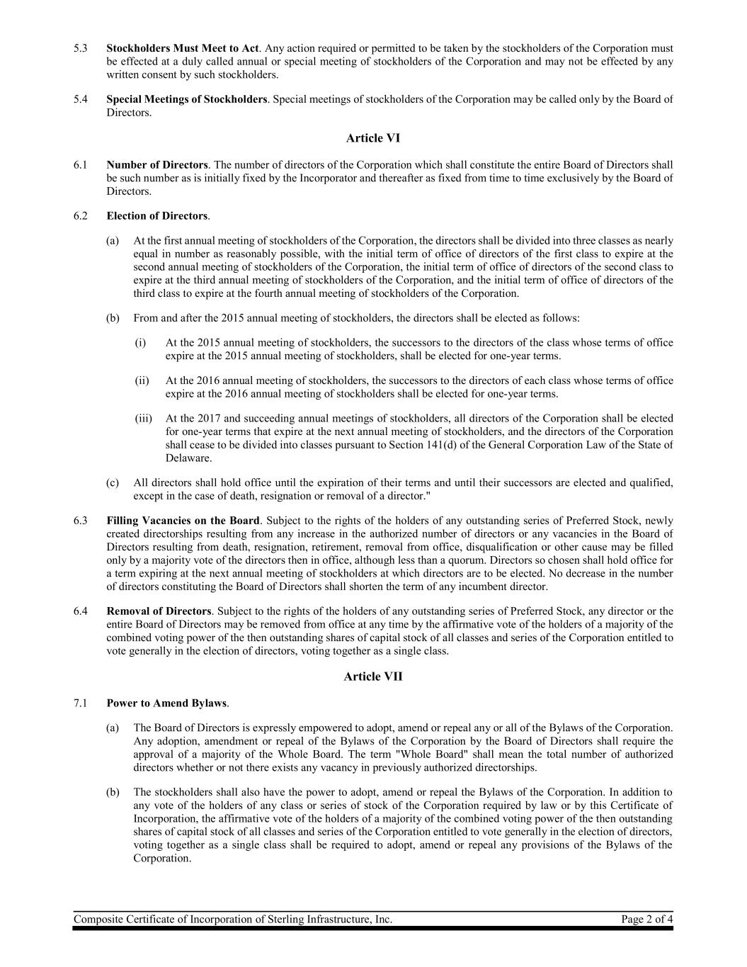 Composite Certificate of Incorporation of Sterling Infrastructure, Inc. Page 2 of 4 5.3 Stockholders Must Meet to Act. Any action required or permitted to be taken by the stockholders of the Corporation must be effected at a duly called annual or special meeting of stockholders of the Corporation and may not be effected by any written consent by such stockholders. 5.4 Special Meetings of Stockholders. Special meetings of stockholders of the Corporation may be called only by the Board of Directors. Article VI 6.1 Number of Directors. The number of directors of the Corporation which shall constitute the entire Board of Directors shall be such number as is initially fixed by the Incorporator and thereafter as fixed from time to time exclusively by the Board of Directors. 6.2 Election of Directors. (a) At the first annual meeting of stockholders of the Corporation, the directors shall be divided into three classes as nearly equal in number as reasonably possible, with the initial term of office of directors of the first class to expire at the second annual meeting of stockholders of the Corporation, the initial term of office of directors of the second class to expire at the third annual meeting of stockholders of the Corporation, and the initial term of office of directors of the third class to expire at the fourth annual meeting of stockholders of the Corporation. (b) From and after the 2015 annual meeting of stockholders, the directors shall be elected as follows: (i) At the 2015 annual meeting of stockholders, the successors to the directors of the class whose terms of office expire at the 2015 annual meeting of stockholders, shall be elected for one-year terms. (ii) At the 2016 annual meeting of stockholders, the successors to the directors of each class whose terms of office expire at the 2016 annual meeting of stockholders shall be elected for one-year terms. (iii) At the 2017 and succeeding annual meetings of stockholders, all directors of the Corporation shall be elected for one-year terms that expire at the next annual meeting of stockholders, and the directors of the Corporation shall cease to be divided into classes pursuant to Section 141(d) of the General Corporation Law of the State of Delaware. (c) All directors shall hold office until the expiration of their terms and until their successors are elected and qualified, except in the case of death, resignation or removal of a director." 6.3 Filling Vacancies on the Board. Subject to the rights of the holders of any outstanding series of Preferred Stock, newly created directorships resulting from any increase in the authorized number of directors or any vacancies in the Board of Directors resulting from death, resignation, retirement, removal from office, disqualification or other cause may be filled only by a majority vote of the directors then in office, although less than a quorum. Directors so chosen shall hold office for a term expiring at the next annual meeting of stockholders at which directors are to be elected. No decrease in the number of directors constituting the Board of Directors shall shorten the term of any incumbent director. 6.4 Removal of Directors. Subject to the rights of the holders of any outstanding series of Preferred Stock, any director or the entire Board of Directors may be removed from office at any time by the affirmative vote of the holders of a majority of the combined voting power of the then outstanding shares of capital stock of all classes and series of the Corporation entitled to vote generally in the election of directors, voting together as a single class. Article VII 7.1 Power to Amend Bylaws. (a) The Board of Directors is expressly empowered to adopt, amend or repeal any or all of the Bylaws of the Corporation. Any adoption, amendment or repeal of the Bylaws of the Corporation by the Board of Directors shall require the approval of a majority of the Whole Board. The term "Whole Board" shall mean the total number of authorized directors whether or not there exists any vacancy in previously authorized directorships. (b) The stockholders shall also have the power to adopt, amend or repeal the Bylaws of the Corporation. In addition to any vote of the holders of any class or series of stock of the Corporation required by law or by this Certificate of Incorporation, the affirmative vote of the holders of a majority of the combined voting power of the then outstanding shares of capital stock of all classes and series of the Corporation entitled to vote generally in the election of directors, voting together as a single class shall be required to adopt, amend or repeal any provisions of the Bylaws of the Corporation.