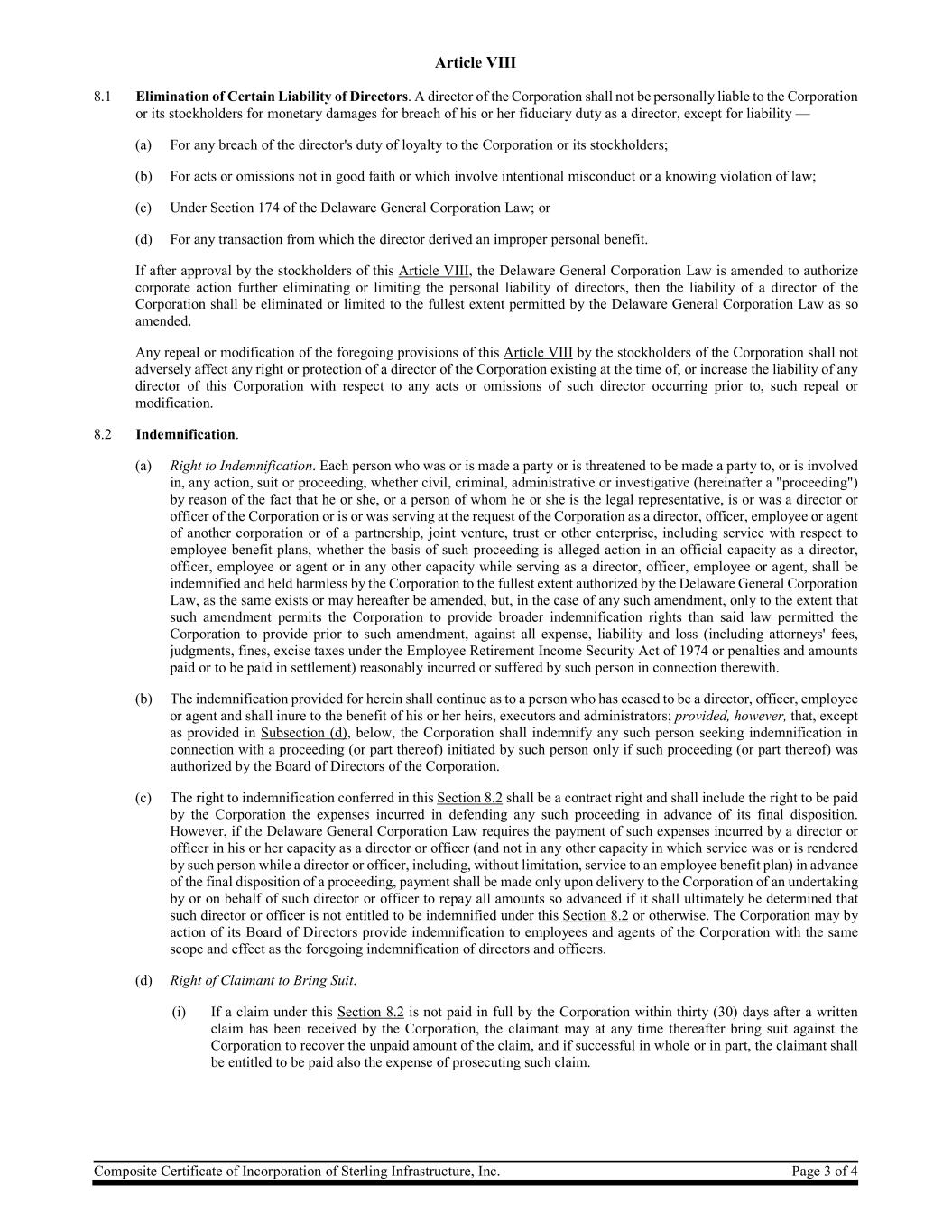 Composite Certificate of Incorporation of Sterling Infrastructure, Inc. Page 3 of 4 Article VIII 8.1 Elimination of Certain Liability of Directors. A director of the Corporation shall not be personally liable to the Corporation or its stockholders for monetary damages for breach of his or her fiduciary duty as a director, except for liability — (a) For any breach of the director's duty of loyalty to the Corporation or its stockholders; (b) For acts or omissions not in good faith or which involve intentional misconduct or a knowing violation of law; (c) Under Section 174 of the Delaware General Corporation Law; or (d) For any transaction from which the director derived an improper personal benefit. If after approval by the stockholders of this Article VIII, the Delaware General Corporation Law is amended to authorize corporate action further eliminating or limiting the personal liability of directors, then the liability of a director of the Corporation shall be eliminated or limited to the fullest extent permitted by the Delaware General Corporation Law as so amended. Any repeal or modification of the foregoing provisions of this Article VIII by the stockholders of the Corporation shall not adversely affect any right or protection of a director of the Corporation existing at the time of, or increase the liability of any director of this Corporation with respect to any acts or omissions of such director occurring prior to, such repeal or modification. 8.2 Indemnification. (a) Right to Indemnification. Each person who was or is made a party or is threatened to be made a party to, or is involved in, any action, suit or proceeding, whether civil, criminal, administrative or investigative (hereinafter a "proceeding") by reason of the fact that he or she, or a person of whom he or she is the legal representative, is or was a director or officer of the Corporation or is or was serving at the request of the Corporation as a director, officer, employee or agent of another corporation or of a partnership, joint venture, trust or other enterprise, including service with respect to employee benefit plans, whether the basis of such proceeding is alleged action in an official capacity as a director, officer, employee or agent or in any other capacity while serving as a director, officer, employee or agent, shall be indemnified and held harmless by the Corporation to the fullest extent authorized by the Delaware General Corporation Law, as the same exists or may hereafter be amended, but, in the case of any such amendment, only to the extent that such amendment permits the Corporation to provide broader indemnification rights than said law permitted the Corporation to provide prior to such amendment, against all expense, liability and loss (including attorneys' fees, judgments, fines, excise taxes under the Employee Retirement Income Security Act of 1974 or penalties and amounts paid or to be paid in settlement) reasonably incurred or suffered by such person in connection therewith. (b) The indemnification provided for herein shall continue as to a person who has ceased to be a director, officer, employee or agent and shall inure to the benefit of his or her heirs, executors and administrators; provided, however, that, except as provided in Subsection (d), below, the Corporation shall indemnify any such person seeking indemnification in connection with a proceeding (or part thereof) initiated by such person only if such proceeding (or part thereof) was authorized by the Board of Directors of the Corporation. (c) The right to indemnification conferred in this Section 8.2 shall be a contract right and shall include the right to be paid by the Corporation the expenses incurred in defending any such proceeding in advance of its final disposition. However, if the Delaware General Corporation Law requires the payment of such expenses incurred by a director or officer in his or her capacity as a director or officer (and not in any other capacity in which service was or is rendered by such person while a director or officer, including, without limitation, service to an employee benefit plan) in advance of the final disposition of a proceeding, payment shall be made only upon delivery to the Corporation of an undertaking by or on behalf of such director or officer to repay all amounts so advanced if it shall ultimately be determined that such director or officer is not entitled to be indemnified under this Section 8.2 or otherwise. The Corporation may by action of its Board of Directors provide indemnification to employees and agents of the Corporation with the same scope and effect as the foregoing indemnification of directors and officers. (d) Right of Claimant to Bring Suit. (i) If a claim under this Section 8.2 is not paid in full by the Corporation within thirty (30) days after a written claim has been received by the Corporation, the claimant may at any time thereafter bring suit against the Corporation to recover the unpaid amount of the claim, and if successful in whole or in part, the claimant shall be entitled to be paid also the expense of prosecuting such claim.
