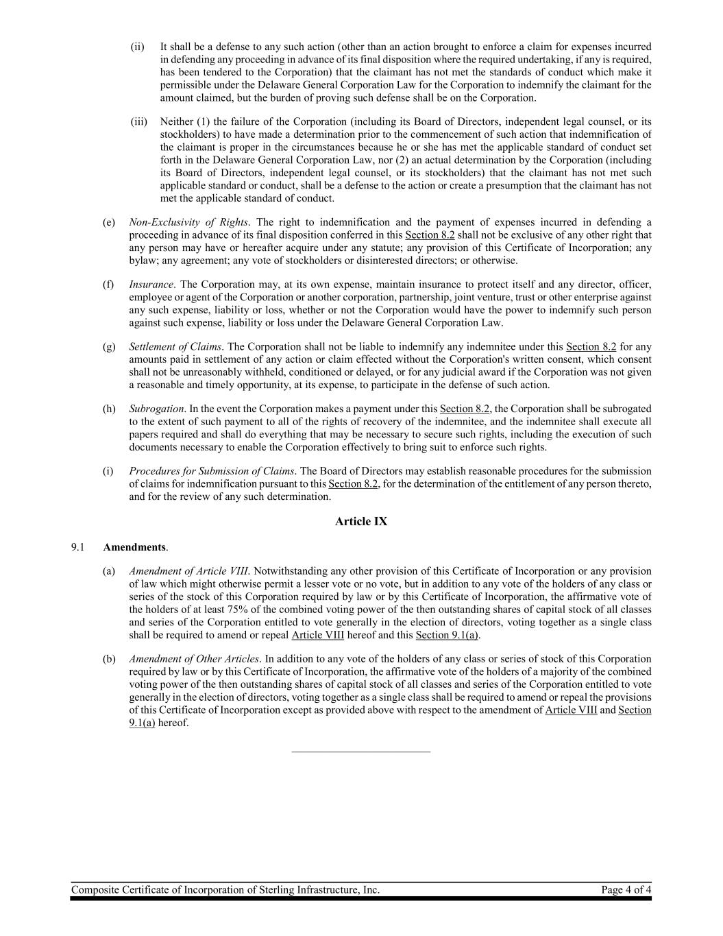 Composite Certificate of Incorporation of Sterling Infrastructure, Inc. Page 4 of 4 (ii) It shall be a defense to any such action (other than an action brought to enforce a claim for expenses incurred in defending any proceeding in advance of its final disposition where the required undertaking, if any is required, has been tendered to the Corporation) that the claimant has not met the standards of conduct which make it permissible under the Delaware General Corporation Law for the Corporation to indemnify the claimant for the amount claimed, but the burden of proving such defense shall be on the Corporation. (iii) Neither (1) the failure of the Corporation (including its Board of Directors, independent legal counsel, or its stockholders) to have made a determination prior to the commencement of such action that indemnification of the claimant is proper in the circumstances because he or she has met the applicable standard of conduct set forth in the Delaware General Corporation Law, nor (2) an actual determination by the Corporation (including its Board of Directors, independent legal counsel, or its stockholders) that the claimant has not met such applicable standard or conduct, shall be a defense to the action or create a presumption that the claimant has not met the applicable standard of conduct. (e) Non-Exclusivity of Rights. The right to indemnification and the payment of expenses incurred in defending a proceeding in advance of its final disposition conferred in this Section 8.2 shall not be exclusive of any other right that any person may have or hereafter acquire under any statute; any provision of this Certificate of Incorporation; any bylaw; any agreement; any vote of stockholders or disinterested directors; or otherwise. (f) Insurance. The Corporation may, at its own expense, maintain insurance to protect itself and any director, officer, employee or agent of the Corporation or another corporation, partnership, joint venture, trust or other enterprise against any such expense, liability or loss, whether or not the Corporation would have the power to indemnify such person against such expense, liability or loss under the Delaware General Corporation Law. (g) Settlement of Claims. The Corporation shall not be liable to indemnify any indemnitee under this Section 8.2 for any amounts paid in settlement of any action or claim effected without the Corporation's written consent, which consent shall not be unreasonably withheld, conditioned or delayed, or for any judicial award if the Corporation was not given a reasonable and timely opportunity, at its expense, to participate in the defense of such action. (h) Subrogation. In the event the Corporation makes a payment under this Section 8.2, the Corporation shall be subrogated to the extent of such payment to all of the rights of recovery of the indemnitee, and the indemnitee shall execute all papers required and shall do everything that may be necessary to secure such rights, including the execution of such documents necessary to enable the Corporation effectively to bring suit to enforce such rights. (i) Procedures for Submission of Claims. The Board of Directors may establish reasonable procedures for the submission of claims for indemnification pursuant to this Section 8.2, for the determination of the entitlement of any person thereto, and for the review of any such determination. Article IX 9.1 Amendments. (a) Amendment of Article VIII. Notwithstanding any other provision of this Certificate of Incorporation or any provision of law which might otherwise permit a lesser vote or no vote, but in addition to any vote of the holders of any class or series of the stock of this Corporation required by law or by this Certificate of Incorporation, the affirmative vote of the holders of at least 75% of the combined voting power of the then outstanding shares of capital stock of all classes and series of the Corporation entitled to vote generally in the election of directors, voting together as a single class shall be required to amend or repeal Article VIII hereof and this Section 9.1(a). (b) Amendment of Other Articles. In addition to any vote of the holders of any class or series of stock of this Corporation required by law or by this Certificate of Incorporation, the affirmative vote of the holders of a majority of the combined voting power of the then outstanding shares of capital stock of all classes and series of the Corporation entitled to vote generally in the election of directors, voting together as a single class shall be required to amend or repeal the provisions of this Certificate of Incorporation except as provided above with respect to the amendment of Article VIII and Section 9.1(a) hereof. _________________________