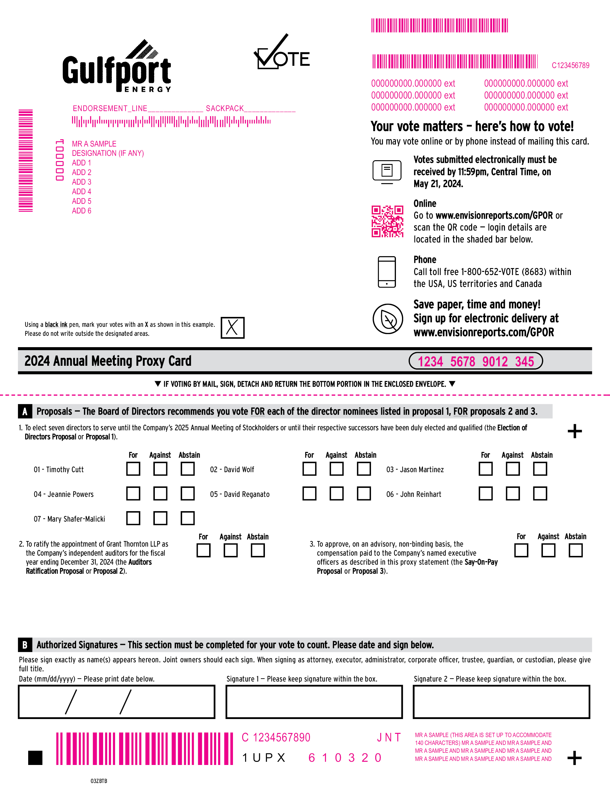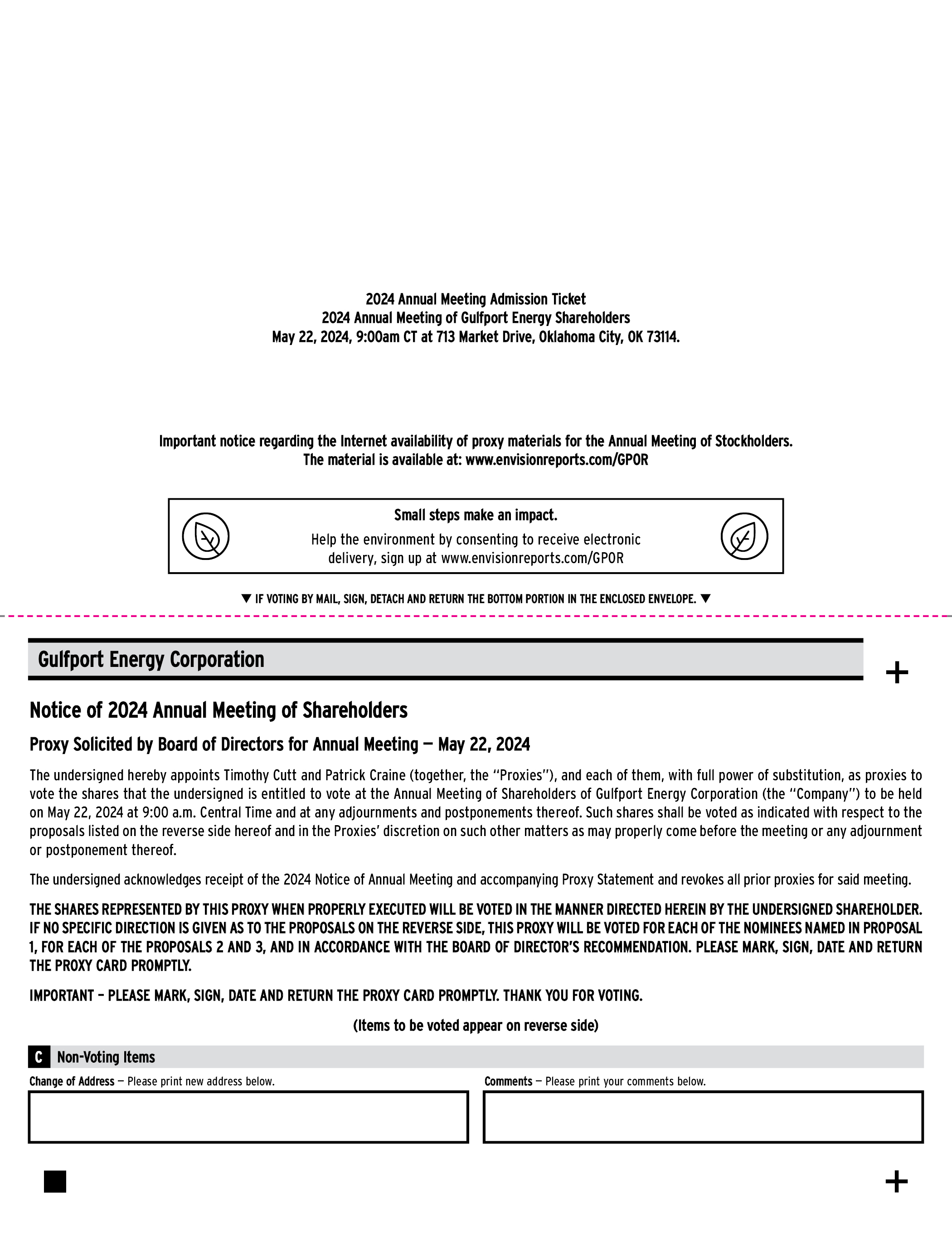 2024 Annual Meeting Admission Ticket 2024 Annual Meeting of Gulfport Energy Shareholders May 22, 2024, 9:00am CT at 713 Market Drive, Oklahoma City, OK 73114. Important notice regarding the Internet availability of proxy materials for the Annual Meeting of Stockholders. The material is available at: www.envisionreports.com/GPOR Small steps make an impact. Help the environment by consenting to receive electronic delivery, sign up at www.envisionreports.com/GPOR T IF VOTING BY MAIL, SIGN, DETACH AND RETURN THE BOTTOM PORTION IN THE ENCLOSED ENVELOPE. T Gulfport Energy Corporation + Notice of 2024 Annual Meeting of Shareholders Proxy Solicited by Board of Directors for Annual Meeting — May 22, 2024 The undersigned hereby appoints Timothy Cutt and Patrick Craine (together, the “Proxies”), and each of them, with full power of substitution, as proxies to vote the shares that the undersigned is entitled to vote at the Annual Meeting of Shareholders of Gulfport Energy Corporation (the “Company”) to be held on May 22, 2024 at 9:00 a.m. Central Time and at any adjournments and postponements thereof. Such shares shall be voted as indicated with respect to the proposals listed on the reverse side hereof and in the Proxies’ discretion on such other matters as may properly come before the meeting or any adjournment or postponement thereof. The undersigned acknowledges receipt of the 2024 Notice of Annual Meeting and accompanying Proxy Statement and revokes all prior proxies for said meeting. THE SHARES REPRESENTED BY THIS PROXY WHEN PROPERLY EXECUTED WILL BE VOTED IN THE MANNER DIRECTED HEREIN BY THE UNDERSIGNED SHAREHOLDER. IF NO SPECIFIC DIRECTION IS GIVEN AS TO THE PROPOSALS ON THE REVERSE SIDE, THIS PROXY WILL BE VOTED FOR EACH OF THE NOMINEES NAMED IN PROPOSAL 1, FOR EACH OF THE PROPOSALS 2 AND 3, AND IN ACCORDANCE WITH THE BOARD OF DIRECTOR’S RECOMMENDATION. PLEASE MARK, SIGN, DATE AND RETURN THE PROXY CARD PROMPTLY. IMPORTANT – PLEASE MARK, SIGN, DATE AND RETURN THE PROXY CARD PROMPTLY. THANK YOU FOR VOTING. C (Items to be voted appear on reverse side) Non-Voting Items Change of Address — Please print new address below. Comments — Please print your comments below. +