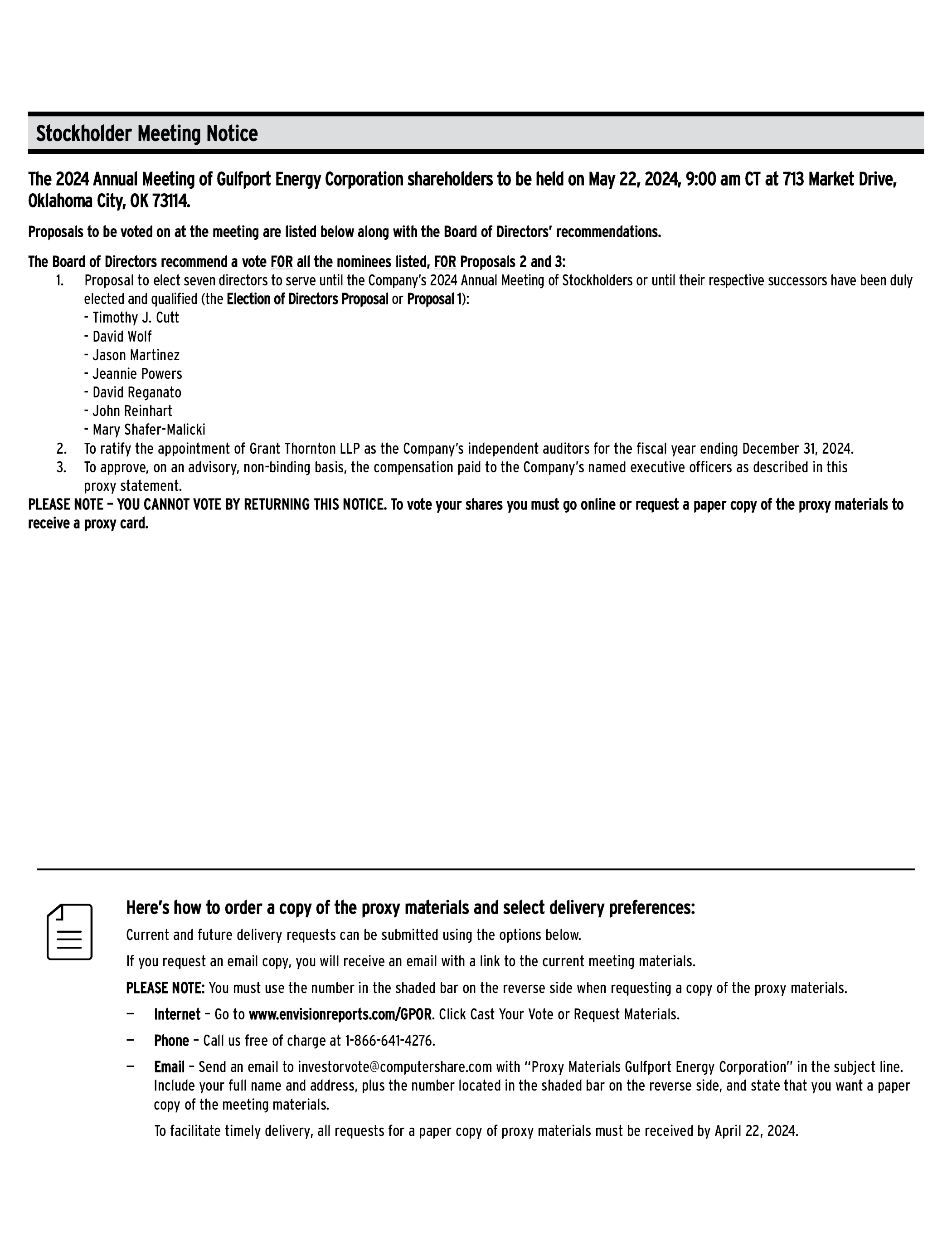 Stockholder Meeting Notice The 2024 Annual Meeting of Gulfport Energy Corporation shareholders to be held on May 22, 2024, 9:00 am CT at 713 Market Drive, Oklahoma City, OK 73114. Proposals to be voted on at the meeting are listed below along with the Board of Directors’ recommendations. The Board of Directors recommend a vote FOR all the nominees listed, FOR Proposals 2 and 3: 1. Proposal to elect seven directors to serve until the Company’s 2024 Annual Meeting of Stockholders or until their respective successors have been duly elected and qualified (the Election of Directors Proposal or Proposal 1): - Timothy J. Cutt - David Wolf - Jason Martinez - Jeannie Powers - David Reganato - John Reinhart - Mary Shafer-Malicki 2. To ratify the appointment of Grant Thornton LLP as the Company’s independent auditors for the fiscal year ending December 31, 2024. 3. To approve, on an advisory, non-binding basis, the compensation paid to the Company’s named executive officers as described in this proxy statement. PLEASE NOTE – YOU CANNOT VOTE BY RETURNING THIS NOTICE. To vote your shares you must go online or request a paper copy of the proxy materials to receive a proxy card. Here’s how to order a copy of the proxy materials and select delivery preferences: Current and future delivery requests can be submitted using the options below. If you request an email copy, you will receive an email with a link to the current meeting materials. PLEASE NOTE: You must use the number in the shaded bar on the reverse side when requesting a copy of the proxy materials. — Internet – Go to www.envisionreports.com/GPOR. Click Cast Your Vote or Request Materials. — Phone – Call us free of charge at 1-866-641-4276. — Email – Send an email to investorvote@computershare.com with “Proxy Materials Gulfport Energy Corporation” in the subject line. Include your full name and address, plus the number located in the shaded bar on the reverse side, and state that you want a paper copy of the meeting materials. To facilitate timely delivery, all requests for a paper copy of proxy materials must be received by April 22, 2024.
