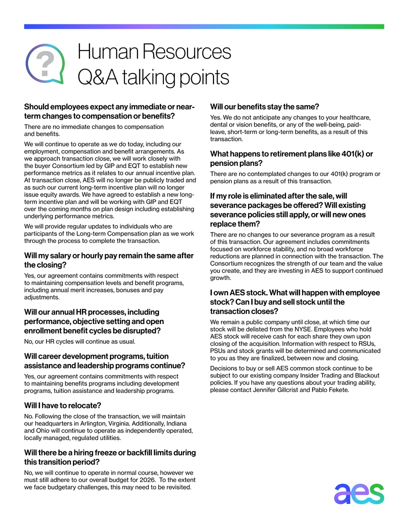Human Resources Q&A talking points Should employees expect any immediate or near- Will our benefits stay the same? term changes to compensation or benefits? Yes. We do not anticipate any changes to your healthcare, dental or vision benefits, or any of the well-being, paid- There are no immediate changes to compensation leave, short-term or long-term benefits, as a result of this and benefits. transaction. We will continue to operate as we do today, including our employment, compensation and benefit arrangements. As What happens to retirement plans like 401(k) or we approach transaction close, we will work closely with pension plans? the buyer Consortium led by GIP and EQT to establish new performance metrics as it relates to our annual incentive plan. There are no contemplated changes to our 401(k) program or At transaction close, AES will no longer be publicly traded and pension plans as a result of this transaction. as such our current long-term incentive plan will no longer issue equity awards. We have agreed to establish a new long- If my role is eliminated after the sale, will term incentive plan and will be working with GIP and EQT severance packages be oer ff ed? Will existing over the coming months on plan design including establishing severance policies still apply, or will new ones underlying performance metrics. replace them? We will provide regular updates to individuals who are participants of the Long-term Compensation plan as we work There are no changes to our severance program as a result through the process to complete the transaction. of this transaction. Our agreement includes commitments focused on workforce stability, and no broad workforce Will my salary or hourly pay remain the same after reductions are planned in connection with the transaction. The Consortium recognizes the strength of our team and the value the closing? you create, and they are investing in AES to support continued Yes, our agreement contains commitments with respect growth. to maintaining compensation levels and benefit programs, including annual merit increases, bonuses and pay I own AES stock. What will happen with employee adjustments. stock? Can I buy and sell stock until the transaction closes? Will our annual HR processes, including performance, objective setting and open We remain a public company until close, at which time our stock will be delisted from the NYSE. Employees who hold enrollment benefit cycles be disrupted? AES stock will receive cash for each share they own upon No, our HR cycles will continue as usual. closing of the acquisition. Information with respect to RSUs, PSUs and stock grants will be determined and communicated Will career development programs, tuition to you as they are finalized, between now and closing. assistance and leadership programs continue? Decisions to buy or sell AES common stock continue to be subject to our existing company Insider Trading and Blackout Yes, our agreement contains commitments with respect policies. If you have any questions about your trading ability, to maintaining benefits programs including development please contact Jennifer Gillcrist and Pablo Fekete. programs, tuition assistance and leadership programs. Will I have to relocate? No. Following the close of the transaction, we will maintain our headquarters in Arlington, Virginia. Additionally, Indiana and Ohio will continue to operate as independently operated, locally managed, regulated utilities. Will there be a hiring freeze or backfill limits during this transition period? No, we will continue to operate in normal course, however we must still adhere to our overall budget for 2026. To the extent we face budgetary challenges, this may need to be revisited.