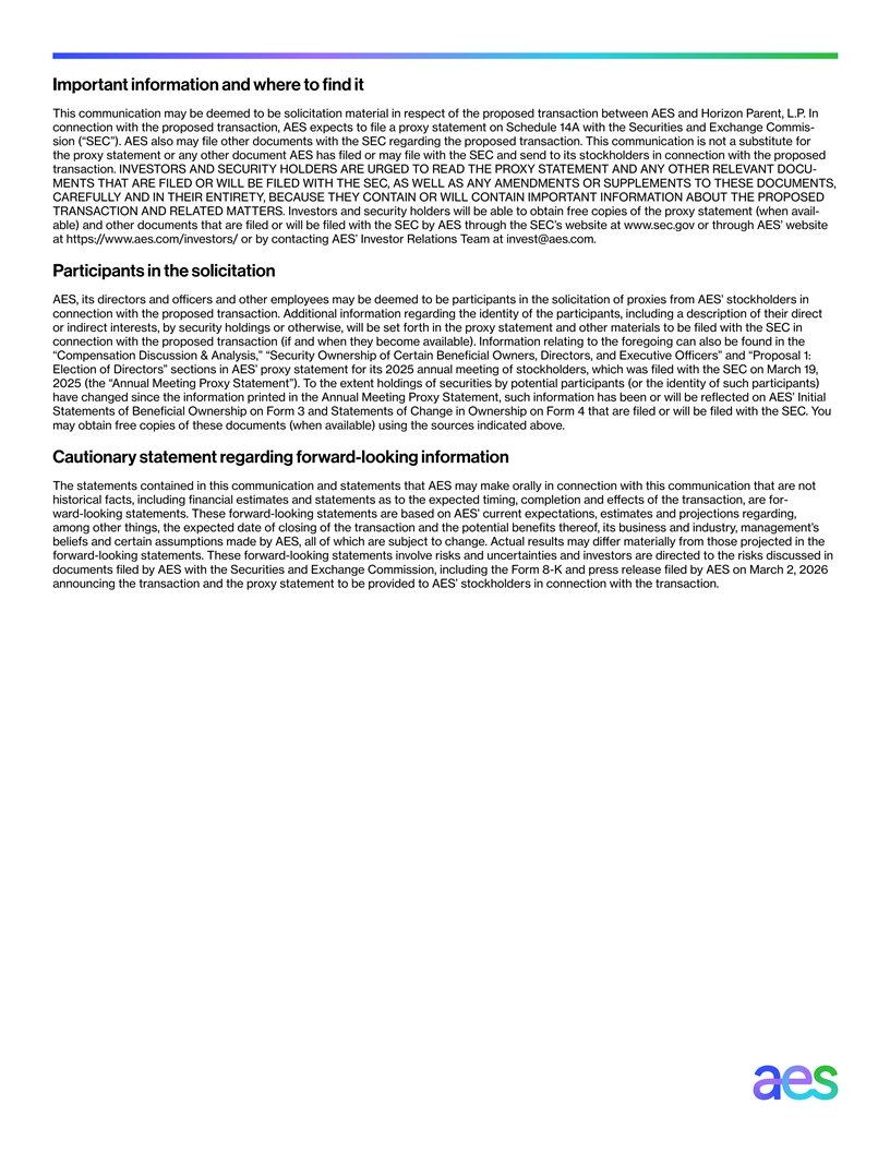 Important information and where to find it This communication may be deemed to be solicitation material in respect of the proposed transaction between AES and Horizon Parent, L.P. In connection with the proposed transaction, AES expects to file a proxy statement on Schedule 14A with the Securities and Exchange Commis - sion (“SEC”). AES also may file other documents with the SEC regarding the proposed transaction. This communication is not a substitute for the proxy statement or any other document AES has filed or may file with the SEC and send to its stockholders in connection with the proposed transaction. INVESTORS AND SECURITY HOLDERS ARE URGED TO READ THE PROXY STATEMENT AND ANY OTHER RELEVANT DOCU- MENTS THAT ARE FILED OR WILL BE FILED WITH THE SEC, AS WELL AS ANY AMENDMENTS OR SUPPLEMENTS TO THESE DOCUMENTS, CAREFULLY AND IN THEIR ENTIRETY, BECAUSE THEY CONTAIN OR WILL CONTAIN IMPORTANT INFORMATION ABOUT THE PROPOSED TRANSACTION AND RELATED MATTERS. Investors and security holders will be able to obtain free copies of the proxy statement (when avail- able) and other documents that are filed or will be filed with the SEC by AES through the SEC’s website at www.sec.gov or through AES’ website at https://www.aes.com/investors/ or by contacting AES’ Investor Relations Team at invest@aes.com. Participants in the solicitation AES, its directors and officers and other employees may be deemed to be participants in the solicitation of proxies from AES’ stockholders in connection with the proposed transaction. Additional information regarding the identity of the participants, including a description of their direct or indirect interests, by security holdings or otherwise, will be set forth in the proxy statement and other materials to be filed with the SEC in connection with the proposed transaction (if and when they become available). Information relating to the foregoing can also be found in the “Compensation Discussion & Analysis,” “Security Ownership of Certain Beneficial Owners, Directors, and Executive Officers” and “Proposal 1: Election of Directors” sections in AES’ proxy statement for its 2025 annual meeting of stockholders, which was filed with the SEC on March 19, 2025 (the “Annual Meeting Proxy Statement”). To the extent holdings of securities by potential participants (or the identity of such participants) have changed since the information printed in the Annual Meeting Proxy Statement, such information has been or will be reflected on AES’ Initial Statements of Beneficial Ownership on Form 3 and Statements of Change in Ownership on Form 4 that are filed or will be filed with the SEC. You may obtain free copies of these documents (when available) using the sources indicated above. Cautionary statement regarding forward-looking information The statements contained in this communication and statements that AES may make orally in connection with this communication that are not historical facts, including financial estimates and statements as to the expected timing, completion and eects o ff f the transaction, are for - ward-looking statements. These forward-looking statements are based on AES’ current expectations, estimates and projections regarding, among other things, the expected date of closing of the transaction and the potential benefits thereof, its business and industry, management’s beliefs and certain assumptions made by AES, all of which are subject to change. Actual results may differ materially from those projected in the forward-looking statements. These forward-looking statements involve risks and uncertainties and investors are directed to the risks discussed in documents filed by AES with the Securities and Exchange Commission, including the Form 8-K and press release filed by AES on March 2, 2026 announcing the transaction and the proxy statement to be provided to AES’ stockholders in connection with the transaction.