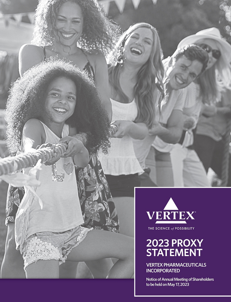 This proxy statement contains forward-looking statements as defined in the Private Securities Litigation Reform Act of 1995, as amended, including, without limitation, statements regarding our marketed products and pipeline therapies, particularly with respect to benefits and safety, potential regulatory submissions and approvals, expected clinical development plans and timing, and expectations regarding commercialization of certain pipeline therapies as well as statements with respect to Vertex’s potential future financial performance and our beliefs regarding the number of people with CF and those potentially eligible for our therapies. While we believe the forward-looking statements contained in this proxy statement are accurate, these forward-looking statements represent our beliefs only as of the date of this proxy statement and there are a number of risks and uncertainties that could cause actual events or results to differ materially from those indicated by such forward-looking statements. Those risks and uncertainties include, among other things, that the company’s expectations regarding its future financial performance may be incorrect (including because one or more of the company’s assumptions underlying its expectations may not be realized), that data from preclinical testing or clinical trials, especially if based on a limited number of patients, may not be indicative of final results, that regulatory authorities may not approve regulatory filings for our pipeline products on a timely basis, or at all, that data from the company’s developmental programs may not support registration or further development programs may not support registration or further development of its potential medicines in a timely manner, or at all, due to safety, efficacy or other reasons, and other risks listed under the heading “Risk Factors” in our Annual Report on Form 10-K for the fiscal year ended December 31, 2022 and available through the company’s website at www.vrtx.com. You should not place undue reliance on these statements, or any data presented. We disclaim any obligation to update the information contained in this proxy statement as new information becomes available.