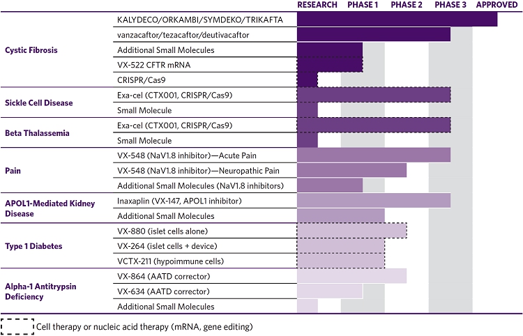 Beyond CF, our robust research and development (“R&D”) pipeline includes multiple mid- and late-stage clinical programs that have already achieved proof-of-concept, including sickle cell disease, beta thalassemia, acute pain, APOL1-mediated kidney disease, and type 1 diabetes, as well as earlier-stage programs in pre-clinical development in diseases such as Duchenne muscular dystrophy and myotonic dystrophy type 1.