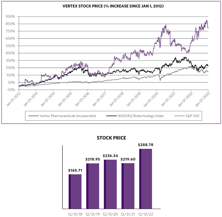 Driven by our outstanding financial performance and pipeline successes, our stock price increased 31.5% from $219.60 per share at the end of 2021 to $288.78 per share at the end of 2022. While we are pleased with our stock performance in 2022, we believe biotechnology companies are best measured over the long term, as opposed to one-year or other shorter-term increments. The following charts show our total shareholder return relative to the Nasdaq Biotechnology Index (“NBI”) and S&P 500 index since the beginning of 2012, when KALYDECO was first approved, as well as our stock price performance over multiple periods. We believe the execution of our differentiated serial innovation strategy will continue to create shareholder value over the long term.