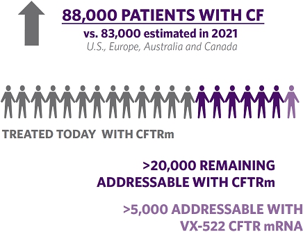 Today, our medicines are collectively being used to treat more than two two-thirds of the approximately 88,000 people with CF in North America, Europe and Australia. These medicines are approved, have broad reimbursement and are accessible in more than 40 countries outside of the U.S. As we look to the future, we expect to grow our CF business through continued uptake of our medicines and label expansions of our commercialized medicines, as well as increases in the number of people living with CF. We also continue to serially innovate in CF, as demonstrated by the completion of enrollment in our Phase 3 clinical trials of our next-generation triple combination and the initiation of clinical trials for a messenger RNA (“mRNA”) therapeutic designed for people with CF who cannot benefit from our existing medicines.