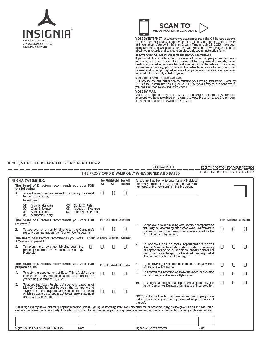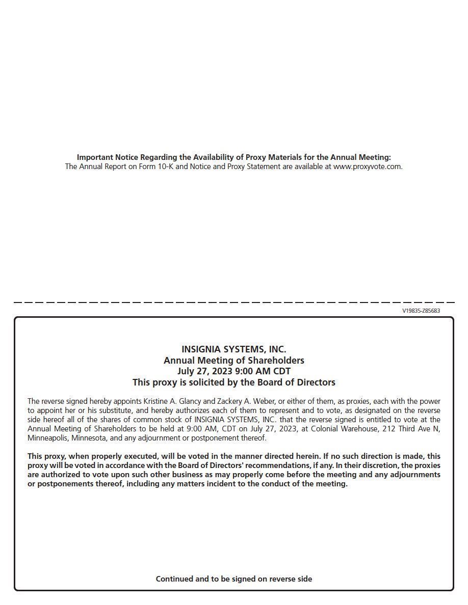 Notice is hereby given that the Annual Meeting of Shareholders of Insignia Systems, Inc. (the “Company”), a Minnesota corporation, will be held on Thursday, July 27, 2023, at 9:00 a.m., Central Time, at Colonial Warehouse, 212 Third Avenue North, Minneapolis, Minnesota for the following purposes: