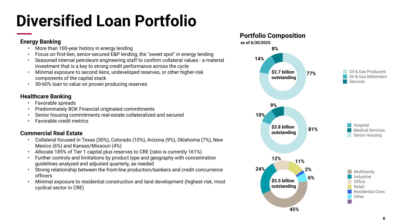 Pri m ar y & se co nd ar y br an d co lor s Data viz colors Data viz monochromatic Diversified Loan Portfolio Portfolio Composition as of 6/30/2025 77% 14% 8% Oil & Gas Producers Oil & Gas Midstream Services 10% 9% 81% Hospital Medical Services Senior Housing 45% 24% 12% 11% 2% 6% Multifamily Industrial Office Retail Residential Cons Other Energy Banking • More than 100-year history in energy lending • Focus on first-lien, senior-secured E&P lending, the "sweet spot" in energy lending • Seasoned internal petroleum engineering staff to confirm collateral values - a material investment that is a key to strong credit performance across the cycle • Minimal exposure to second liens, undeveloped reserves, or other higher-risk components of the capital stack • 50-60% loan to value on proven producing reserves Healthcare Banking • Favorable spreads • Predominately BOK Financial originated commitments • Senior housing commitments real-estate collateralized and secured • Favorable credit metrics Commercial Real Estate • Collateral focused in Texas (30%), Colorado (10%), Arizona (9%), Oklahoma (7%), New Mexico (6%) and Kansas/Missouri (4%) • Allocate 185% of Tier 1 capital plus reserves to CRE (ratio is currently 161%) • Further controls and limitations by product type and geography with concentration guidelines analyzed and adjusted quarterly, as needed • Strong relationship between the front-line production/bankers and credit concurrence officers • Minimal exposure to residential construction and land development (highest risk, most cyclical sector in CRE) $2.7 billion outstanding $3.8 billion outstanding $5.5 billion outstanding 6