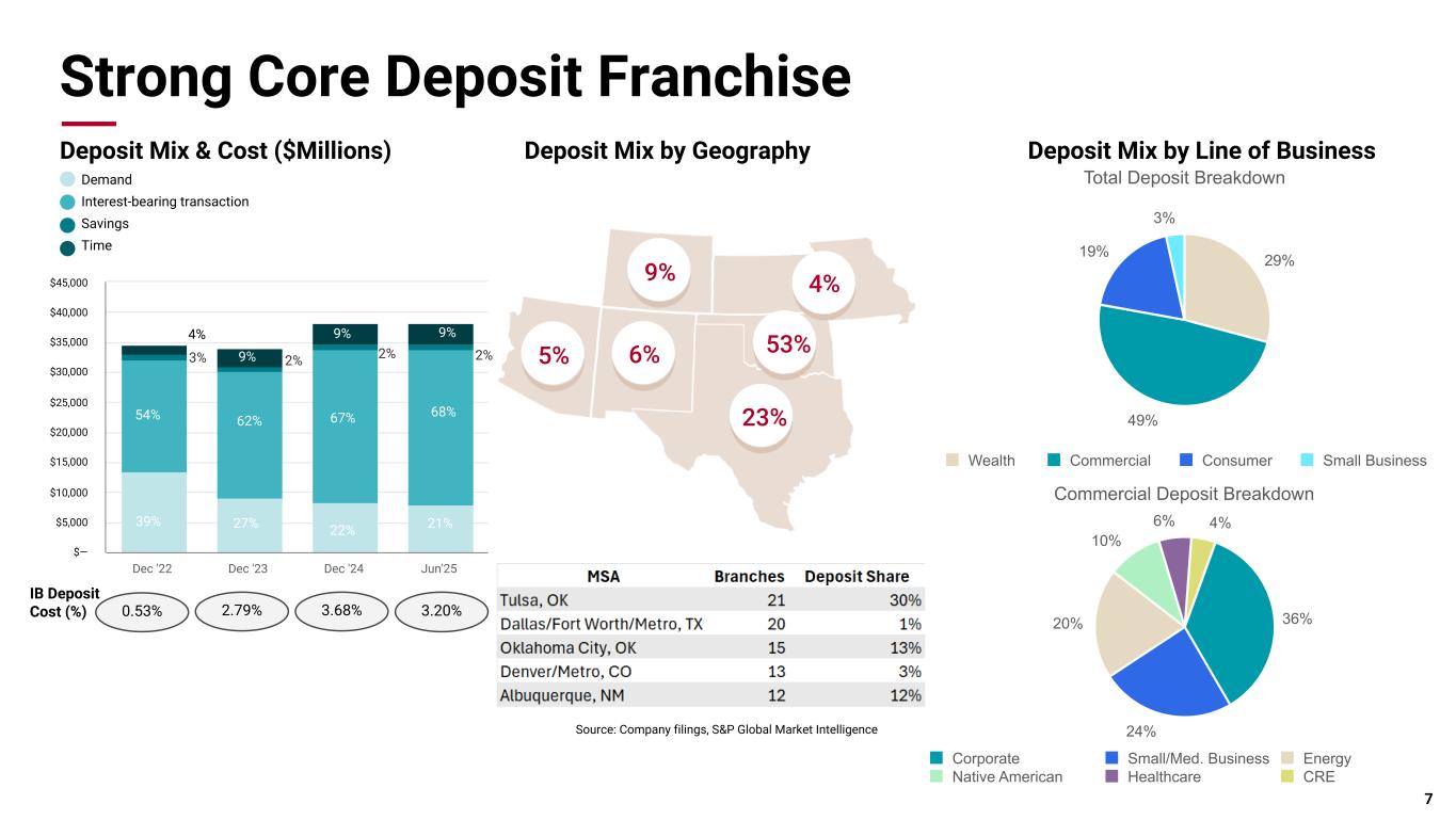 Pri m ar y & se co nd ar y br an d co lor s Data viz colors Data viz monochromatic Legal Disclaimers 2 This presentation contains forward-looking statements that are based on management's beliefs, assumptions, current expectations, estimates and projections about BOK Financial Corporation, the financial services industry, and the economy generally. Words such as “anticipates,” “believes,” “estimates,” “expects,” “forecasts,” “plans,” "outlook," “projects,” “will,” “intends,” variations of such words and similar expressions are intended to identify such forward-looking statements. Management judgments relating to and discussion of the provision and allowance for credit losses, allowance for uncertain tax positions, accruals for loss contingencies and valuation of mortgage servicing rights involve judgments as to expected events and are inherently forward-looking statements. Assessments that acquisitions and growth endeavors will be profitable are necessary statements of belief as to the outcome of future events based in part on information provided by others which BOK Financial has not independently verified. These various forward-looking statements are not guarantees of future performance and involve certain risks, uncertainties, and assumptions which are difficult to predict with regard to timing, extent, likelihood and degree of occurrence. Therefore, actual results and outcomes may materially differ from what is expected, implied or forecasted in such forward-looking statements. Internal and external factors that might cause such a difference include, but are not limited to changes in government, changes in governmental economic policy, including tariffs, changes in commodity prices, interest rates and interest rate relationships, inflation, demand for products and services, the degree of competition by traditional and nontraditional competitors, changes in banking regulations, tax laws, prices, levies and assessments, the impact of technological advances, and trends in customer behavior as well as their ability to repay loans. For a discussion of risk factors that may cause actual results to differ from expectations, please refer to BOK Financial Corporation’s most recent annual and quarterly reports. BOK Financial Corporation and its affiliates undertake no obligation to update, amend, or clarify forward-looking statements, whether as a result of new information, future events, or otherwise. Non-GAAP Financial Measures: This presentation may refer to non-GAAP financial measures. Additional information on these financial measures is available in BOK Financial’s Form 8-K filings furnished pursuant to Item 2.02, which can be accessed at bokf.com. All data is presented as of June 30, 2025 unless otherwise noted.
