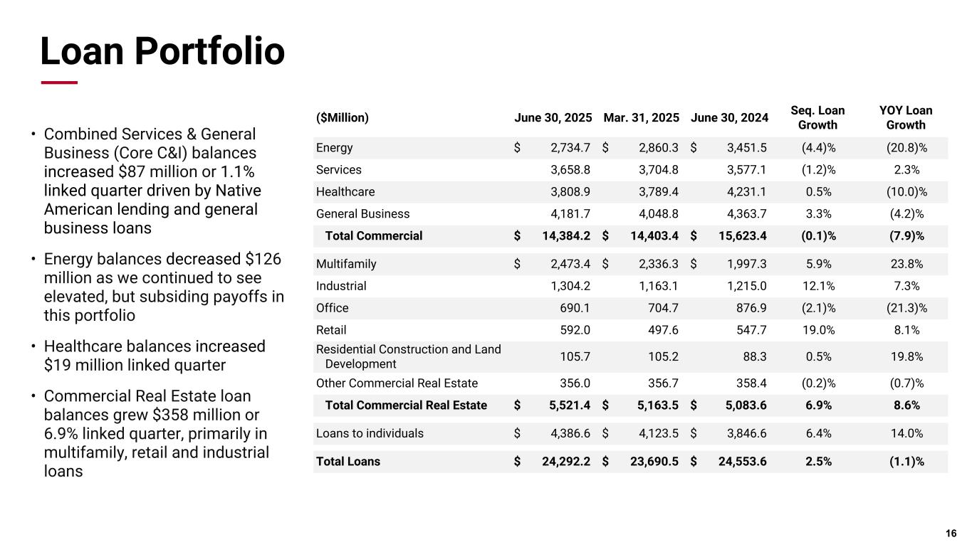 Pri m ar y & se co nd ar y br an d co lor s Data viz colors Data viz monochromatic Loan Portfolio • Combined Services & General Business (Core C&I) balances increased $87 million or 1.1% linked quarter driven by Native American lending and general business loans • Energy balances decreased $126 million as we continued to see elevated, but subsiding payoffs in this portfolio • Healthcare balances increased $19 million linked quarter • Commercial Real Estate loan balances grew $358 million or 6.9% linked quarter, primarily in multifamily, retail and industrial loans 16 ($Million) June 30, 2025 Mar. 31, 2025 June 30, 2024 Seq. Loan Growth YOY Loan Growth Energy $ 2,734.7 $ 2,860.3 $ 3,451.5 (4.4)% (20.8)% Services 3,658.8 3,704.8 3,577.1 (1.2)% 2.3% Healthcare 3,808.9 3,789.4 4,231.1 0.5% (10.0)% General Business 4,181.7 4,048.8 4,363.7 3.3% (4.2)% Total Commercial $ 14,384.2 $ 14,403.4 $ 15,623.4 (0.1)% (7.9)% Multifamily $ 2,473.4 $ 2,336.3 $ 1,997.3 5.9% 23.8% Industrial 1,304.2 1,163.1 1,215.0 12.1% 7.3% Office 690.1 704.7 876.9 (2.1)% (21.3)% Retail 592.0 497.6 547.7 19.0% 8.1% Residential Construction and Land Development 105.7 105.2 88.3 0.5% 19.8% Other Commercial Real Estate 356.0 356.7 358.4 (0.2)% (0.7)% Total Commercial Real Estate $ 5,521.4 $ 5,163.5 $ 5,083.6 6.9% 8.6% Loans to individuals $ 4,386.6 $ 4,123.5 $ 3,846.6 6.4% 14.0% Total Loans $ 24,292.2 $ 23,690.5 $ 24,553.6 2.5% (1.1)%