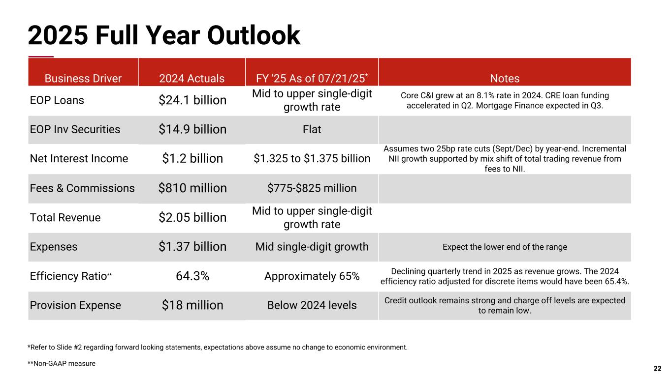 Pri m ar y & se co nd ar y br an d co lor s Data viz colors Data viz monochromatic 2025 Full Year Outlook 22 *Refer to Slide #2 regarding forward looking statements, expectations above assume no change to economic environment. **Non-GAAP measure Business Driver 2024 Actuals FY '25 As of 07/21/25* Notes EOP Loans $24.1 billion Mid to upper single-digit growth rate Core C&I grew at an 8.1% rate in 2024. CRE loan funding accelerated in Q2. Mortgage Finance expected in Q3. EOP Inv Securities $14.9 billion Flat Net Interest Income $1.2 billion $1.325 to $1.375 billion Assumes two 25bp rate cuts (Sept/Dec) by year-end. Incremental NII growth supported by mix shift of total trading revenue from fees to NII. Fees & Commissions $810 million $775-$825 million Total Revenue $2.05 billion Mid to upper single-digit growth rate Expenses $1.37 billion Mid single-digit growth Expect the lower end of the range Efficiency Ratio** 64.3% Approximately 65% Declining quarterly trend in 2025 as revenue grows. The 2024 efficiency ratio adjusted for discrete items would have been 65.4%. Provision Expense $18 million Below 2024 levels Credit outlook remains strong and charge off levels are expected to remain low.