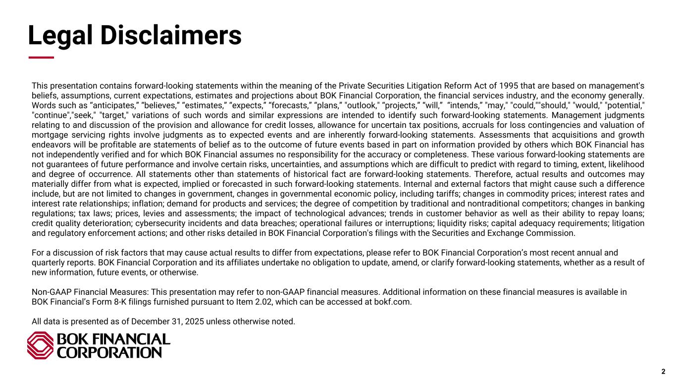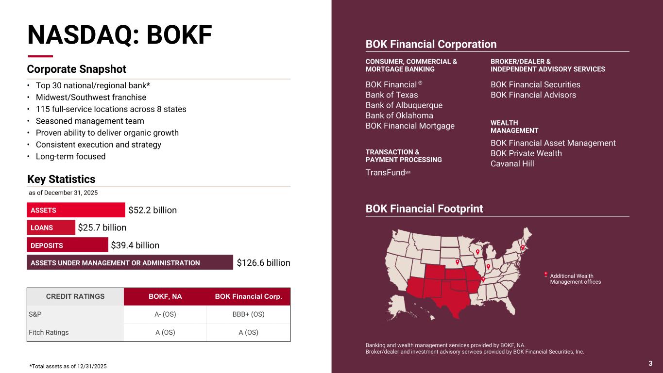 Pri m ar y & se co nd ar y br an d co lor s Data viz colors Data viz monochromatic Legal Disclaimers 2 This presentation contains forward-looking statements within the meaning of the Private Securities Litigation Reform Act of 1995 that are based on management's beliefs, assumptions, current expectations, estimates and projections about BOK Financial Corporation, the financial services industry, and the economy generally. Words such as “anticipates,” “believes,” “estimates,” “expects,” “forecasts,” “plans,” "outlook," “projects,” “will,” “intends,” "may," "could,""should," "would," "potential," "continue","seek," "target," variations of such words and similar expressions are intended to identify such forward-looking statements. Management judgments relating to and discussion of the provision and allowance for credit losses, allowance for uncertain tax positions, accruals for loss contingencies and valuation of mortgage servicing rights involve judgments as to expected events and are inherently forward-looking statements. Assessments that acquisitions and growth endeavors will be profitable are statements of belief as to the outcome of future events based in part on information provided by others which BOK Financial has not independently verified and for which BOK Financial assumes no responsibility for the accuracy or completeness. These various forward-looking statements are not guarantees of future performance and involve certain risks, uncertainties, and assumptions which are difficult to predict with regard to timing, extent, likelihood and degree of occurrence. All statements other than statements of historical fact are forward-looking statements. Therefore, actual results and outcomes may materially differ from what is expected, implied or forecasted in such forward-looking statements. Internal and external factors that might cause such a difference include, but are not limited to changes in government, changes in governmental economic policy, including tariffs; changes in commodity prices; interest rates and interest rate relationships; inflation; demand for products and services; the degree of competition by traditional and nontraditional competitors; changes in banking regulations; tax laws; prices, levies and assessments; the impact of technological advances; trends in customer behavior as well as their ability to repay loans; credit quality deterioration; cybersecurity incidents and data breaches; operational failures or interruptions; liquidity risks; capital adequacy requirements; litigation and regulatory enforcement actions; and other risks detailed in BOK Financial Corporation's filings with the Securities and Exchange Commission. For a discussion of risk factors that may cause actual results to differ from expectations, please refer to BOK Financial Corporation’s most recent annual and quarterly reports. BOK Financial Corporation and its affiliates undertake no obligation to update, amend, or clarify forward-looking statements, whether as a result of new information, future events, or otherwise. Non-GAAP Financial Measures: This presentation may refer to non-GAAP financial measures. Additional information on these financial measures is available in BOK Financial’s Form 8-K filings furnished pursuant to Item 2.02, which can be accessed at bokf.com. All data is presented as of December 31, 2025 unless otherwise noted.