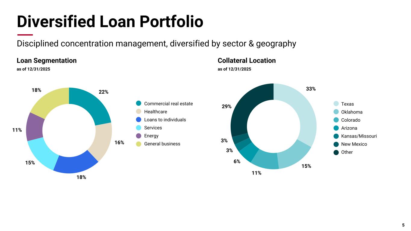 Pri m ar y & se co nd ar y br an d co lor s Data viz colors Data viz monochromatic Core Strategy Build a bank with diverse revenues that can compete upstream and outperform peers across varying economic cycles. *Chart data based on Bloomberg EPS data for BOKF and KRX index members as of 2025. Chart data is indexed to 1 as of 1995. 4 "There is no principle more emphasized in our organization than managing for long-term value rather than short-term results." George Kaiser, Chairman Long-term EPS Growth vs. KRX Median* BOKF KRX Median 19 95 19 96 19 97 19 98 19 99 20 00 20 01 20 02 20 03 20 04 20 05 20 06 20 07 20 08 20 09 20 10 20 11 20 12 20 13 20 14 20 15 20 16 20 17 20 18 20 19 20 20 20 21 20 22 20 23 20 24 20 25 0 2 4 6 8 10 12 BOKF CAGR = 8.0% KRX CAGR = 4.6%