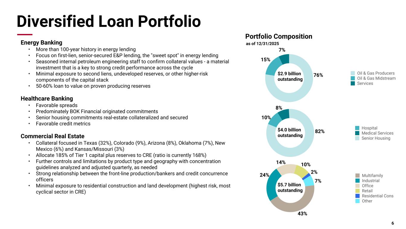 Pri m ar y & se co nd ar y br an d co lor s Data viz colors Data viz monochromatic Diversified Loan Portfolio Disciplined concentration management, diversified by sector & geography Loan Segmentation Collateral Location as of 12/31/2025 as of 12/31/2025 Commercial real estate Healthcare Loans to individuals Services Energy General business Texas Oklahoma Colorado Arizona Kansas/Missouri New Mexico Other 5 22% 16% 18% 15% 11% 18% 33% 15% 11% 6% 3% 3% 29%