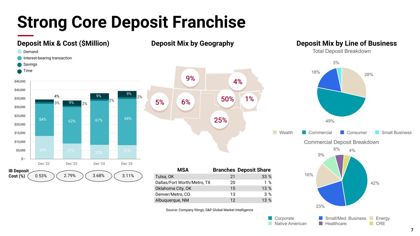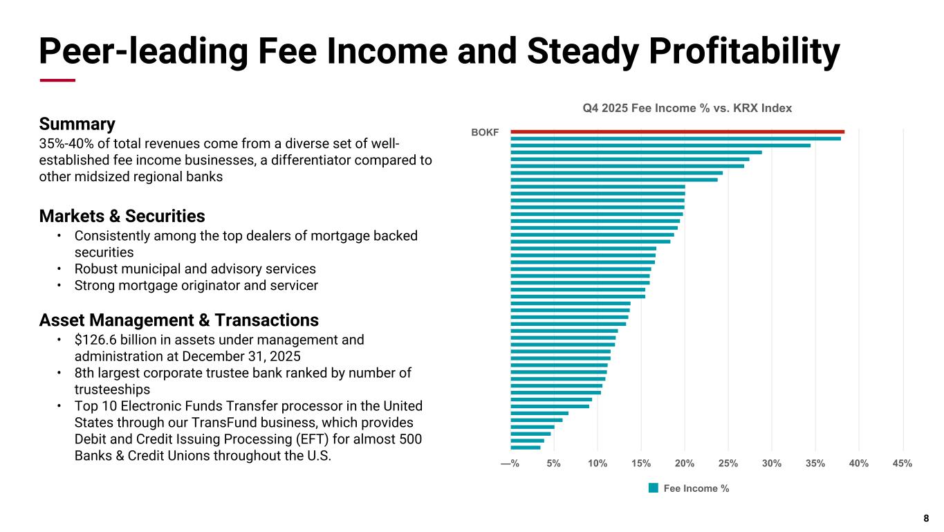 Pri m ar y & se co nd ar y br an d co lor s Data viz colors Data viz monochromatic Dec '22 Dec '23 Dec '24 Dec '25 $— $5,000 $10,000 $15,000 $20,000 $25,000 $30,000 $35,000 $40,000 $45,000 Strong Core Deposit Franchise Deposit Mix & Cost ($Million) Deposit Mix by Geography 4% 50% 9% 5% 6% 25% Demand Interest-bearing transaction Savings Time 7 Source: Company filings, S&P Global Market Intelligence Deposit Mix by Line of Business Total Deposit Breakdown 28% 49% 18% 3% Wealth Commercial Consumer Small Business Commercial Deposit Breakdown 42% 23% 16% 9% 6% 4% Corporate Small/Med. Business Energy Native American Healthcare CRE IB Deposit Cost (%) 3.11%3.68%2.79%0.53% 39% 54% 4% 3% 27% 62% 2%9% 22% 67% 9% 2% 21% 68% 2% 9% MSA Branches Deposit Share Tulsa, OK 21 33 % Dallas/Fort Worth/Metro, TX 20 1 % Oklahoma City, OK 15 13 % Denver/Metro, CO 13 3 % Albuquerque, NM 12 13 % 1%
