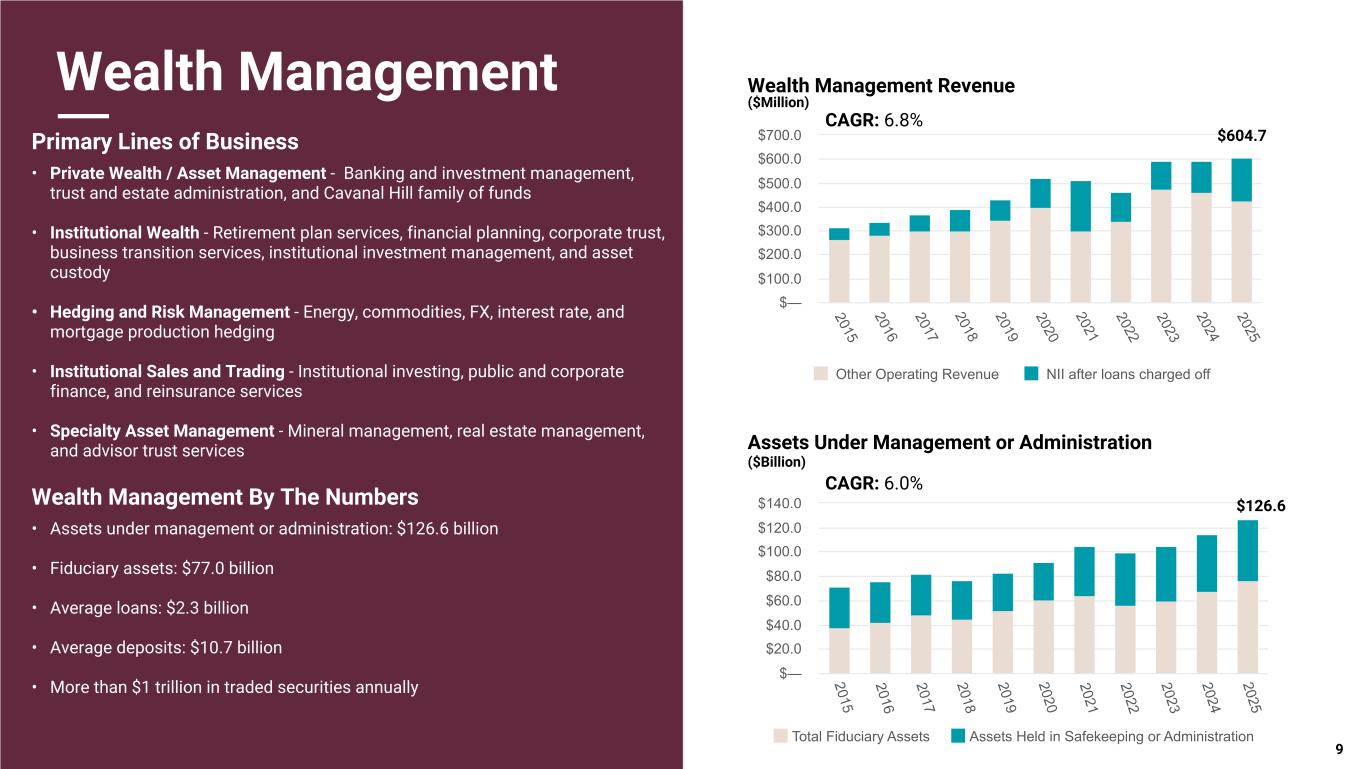Pri m ar y & se co nd ar y br an d co lor s Data viz colors Data viz monochromatic Wealth Management Primary Lines of Business • Private Wealth / Asset Management - Banking and investment management, trust and estate administration, and Cavanal Hill family of funds • Institutional Wealth - Retirement plan services, financial planning, corporate trust, business transition services, institutional investment management, and asset custody • Hedging and Risk Management - Energy, commodities, FX, interest rate, and mortgage production hedging • Institutional Sales and Trading - Institutional investing, public and corporate finance, and reinsurance services • Specialty Asset Management - Mineral management, real estate management, and advisor trust services Wealth Management By The Numbers • Assets under management or administration: $126.6 billion • Fiduciary assets: $77.0 billion • Average loans: $2.3 billion • Average deposits: $10.7 billion • More than $1 trillion in traded securities annually Assets Under Management or Administration ($Billion) Wealth Management Revenue ($Million) 9 Total Fiduciary Assets Assets Held in Safekeeping or Administration 2015 2016 2017 2018 2019 2020 2021 2022 2023 2024 2025 $— $20.0 $40.0 $60.0 $80.0 $100.0 $120.0 $140.0 CAGR: 6.0% Other Operating Revenue NII after loans charged off 2015 2016 2017 2018 2019 2020 2021 2022 2023 2024 2025 $— $100.0 $200.0 $300.0 $400.0 $500.0 $600.0 $700.0 CAGR: 6.8% $604.7 $126.6