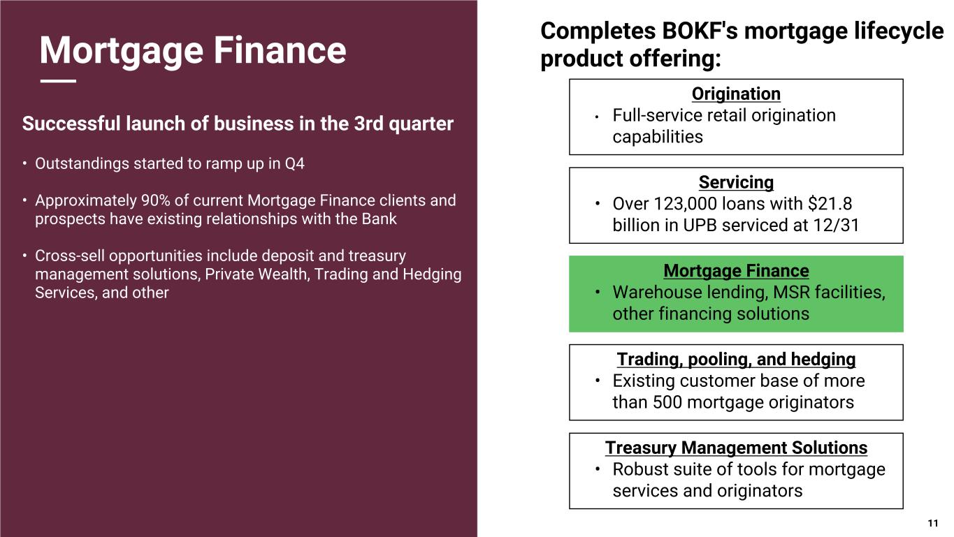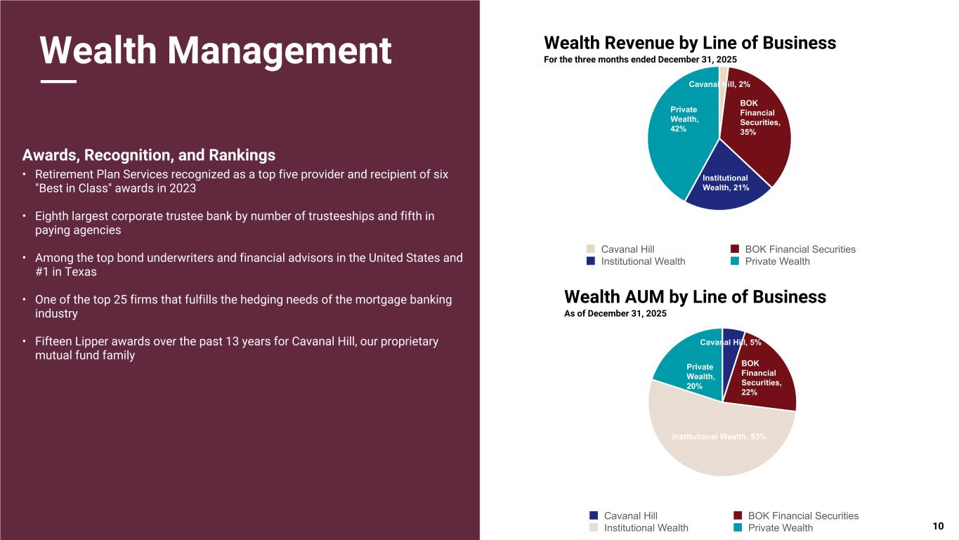 Pri m ar y & se co nd ar y br an d co lor s Data viz colors Data viz monochromatic Wealth Management Awards, Recognition, and Rankings • Retirement Plan Services recognized as a top five provider and recipient of six "Best in Class" awards in 2023 • Eighth largest corporate trustee bank by number of trusteeships and fifth in paying agencies • Among the top bond underwriters and financial advisors in the United States and #1 in Texas • One of the top 25 firms that fulfills the hedging needs of the mortgage banking industry • Fifteen Lipper awards over the past 13 years for Cavanal Hill, our proprietary mutual fund family 10 Cavanal Hill, 2% BOK Financial Securities, 35% Institutional Wealth, 21% Private Wealth, 42% Cavanal Hill BOK Financial Securities Institutional Wealth Private Wealth Cavanal Hill, 5% BOK Financial Securities, 22% Institutional Wealth, 53% Private Wealth, 20% Cavanal Hill BOK Financial Securities Institutional Wealth Private Wealth Wealth AUM by Line of Business Wealth Revenue by Line of Business For the three months ended December 31, 2025 As of December 31, 2025