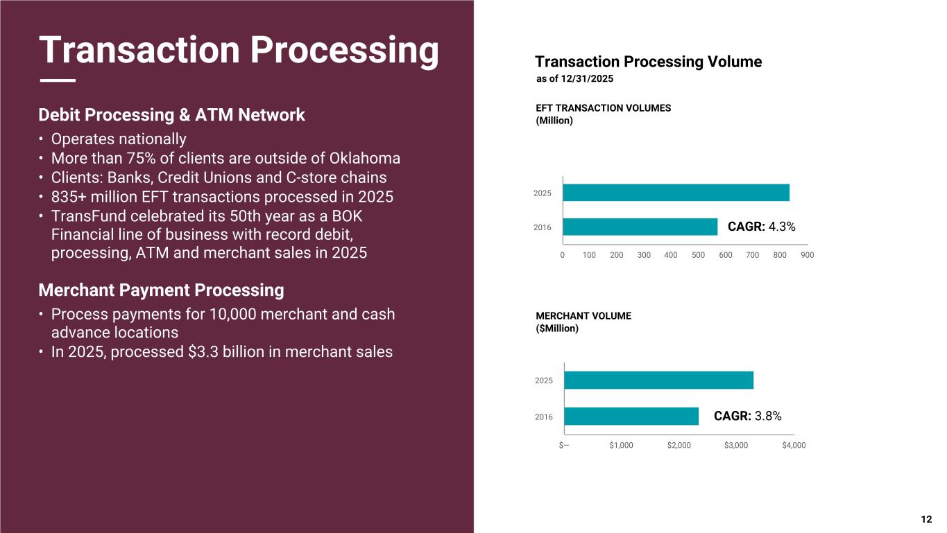 Pri m ar y & se co nd ar y br an d co lor s Data viz colors Data viz monochromatic Transaction Processing CAGR: 4.3% CAGR: 3.8% Debit Processing & ATM Network • Operates nationally • More than 75% of clients are outside of Oklahoma • Clients: Banks, Credit Unions and C-store chains • 835+ million EFT transactions processed in 2025 • TransFund celebrated its 50th year as a BOK Financial line of business with record debit, processing, ATM and merchant sales in 2025 Merchant Payment Processing • Process payments for 10,000 merchant and cash advance locations • In 2025, processed $3.3 billion in merchant sales MERCHANT VOLUME ($Million) EFT TRANSACTION VOLUMES (Million) Transaction Processing Volume as of 12/31/2025 12 0 100 200 300 400 500 600 700 800 900 2025 2016 $— $1,000 $2,000 $3,000 $4,000 2025 2016