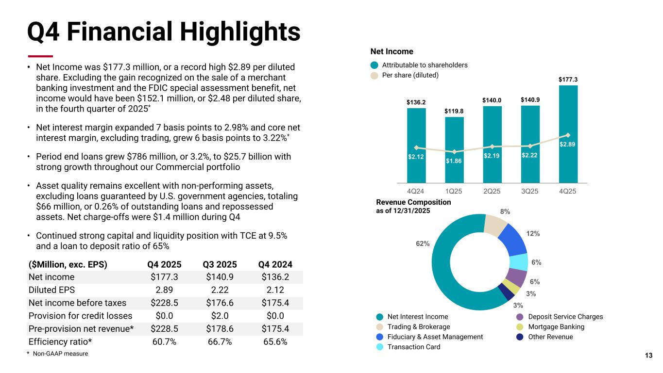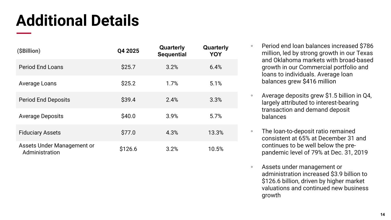 Pri m ar y & se co nd ar y br an d co lor s Data viz colors Data viz monochromatic Q4 Financial Highlights * Non-GAAP measure Attributable to shareholders Per share (diluted) Net Income • Net Income was $177.3 million, or a record high $2.89 per diluted share. Excluding the gain recognized on the sale of a merchant banking investment and the FDIC special assessment benefit, net income would have been $152.1 million, or $2.48 per diluted share, in the fourth quarter of 2025* • Net interest margin expanded 7 basis points to 2.98% and core net interest margin, excluding trading, grew 6 basis points to 3.22%* • Period end loans grew $786 million, or 3.2%, to $25.7 billion with strong growth throughout our Commercial portfolio • Asset quality remains excellent with non-performing assets, excluding loans guaranteed by U.S. government agencies, totaling $66 million, or 0.26% of outstanding loans and repossessed assets. Net charge-offs were $1.4 million during Q4 • Continued strong capital and liquidity position with TCE at 9.5% and a loan to deposit ratio of 65% 13 $136.2 $119.8 $140.0 $140.9 $177.3 $2.12 $1.86 $2.19 $2.22 $2.89 4Q24 1Q25 2Q25 3Q25 4Q25 ($Million, exc. EPS) Q4 2025 Q3 2025 Q4 2024 Net income $177.3 $140.9 $136.2 Diluted EPS 2.89 2.22 2.12 Net income before taxes $228.5 $176.6 $175.4 Provision for credit losses $0.0 $2.0 $0.0 Pre-provision net revenue* $228.5 $178.6 $175.4 Efficiency ratio* 60.7% 66.7% 65.6% Revenue Composition as of 12/31/2025 62% 8% 12% 6% 6% 3% 3% Net Interest Income Trading & Brokerage Fiduciary & Asset Management Transaction Card Deposit Service Charges Mortgage Banking Other Revenue