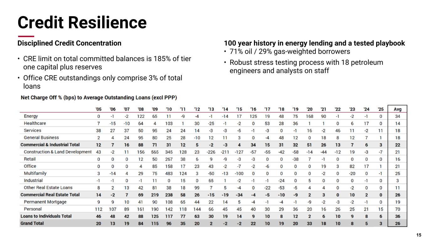 Pri m ar y & se co nd ar y br an d co lor s Data viz colors Data viz monochromatic Additional Details 14 ◦ Period end loan balances increased $786 million, led by strong growth in our Texas and Oklahoma markets with broad-based growth in our Commercial portfolio and loans to individuals. Average loan balances grew $416 million ◦ Average deposits grew $1.5 billion in Q4, largely attributed to interest-bearing transaction and demand deposit balances ◦ The loan-to-deposit ratio remained consistent at 65% at December 31 and continues to be well below the pre- pandemic level of 79% at Dec. 31, 2019 ◦ Assets under management or administration increased $3.9 billion to $126.6 billion, driven by higher market valuations and continued new business growth ($Billion) Q4 2025 Quarterly Sequential Quarterly YOY Period End Loans $25.7 3.2% 6.4% Average Loans $25.2 1.7% 5.1% Period End Deposits $39.4 2.4% 3.3% Average Deposits $40.0 3.9% 5.7% Fiduciary Assets $77.0 4.3% 13.3% Assets Under Management or Administration $126.6 3.2% 10.5%