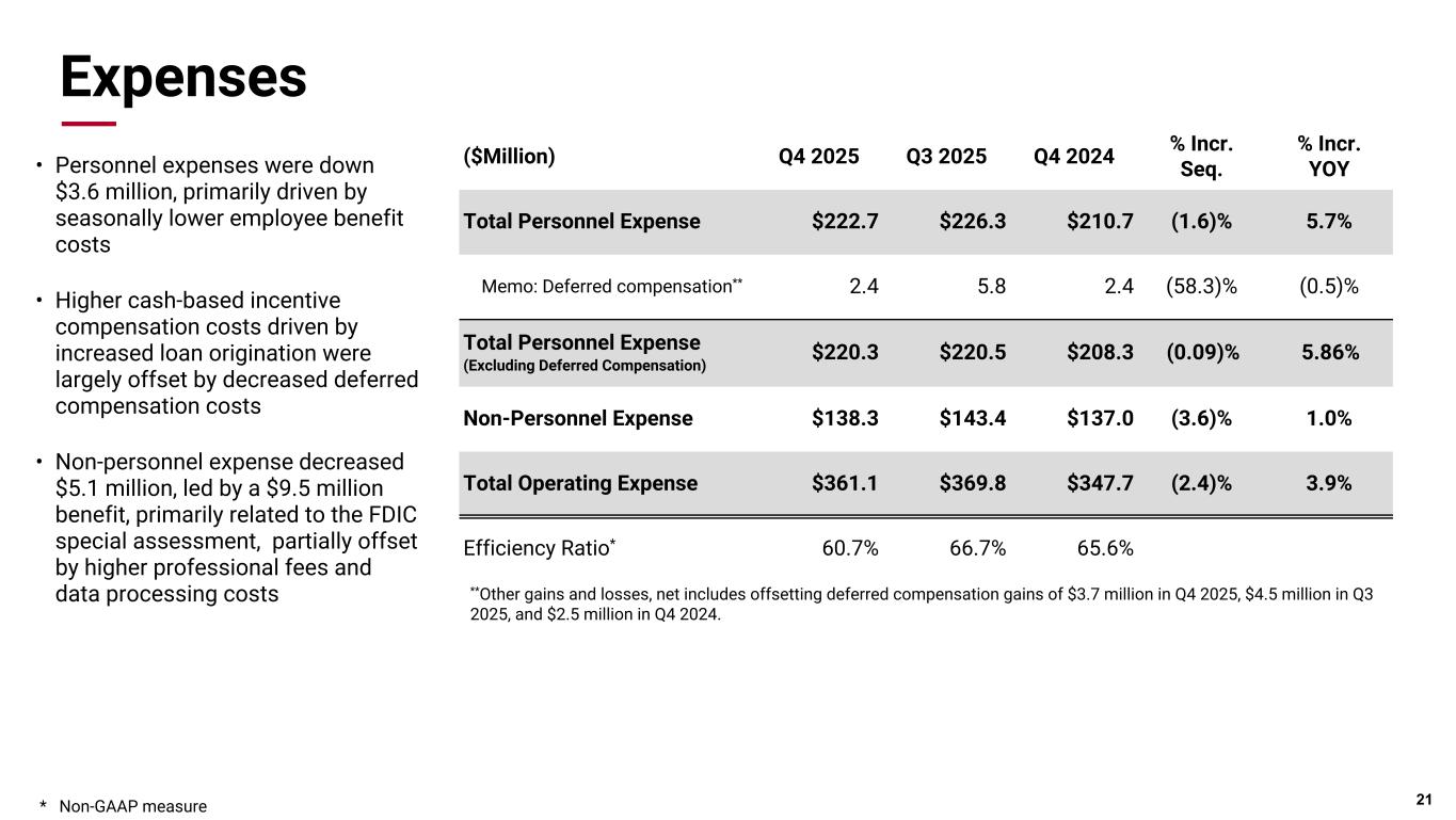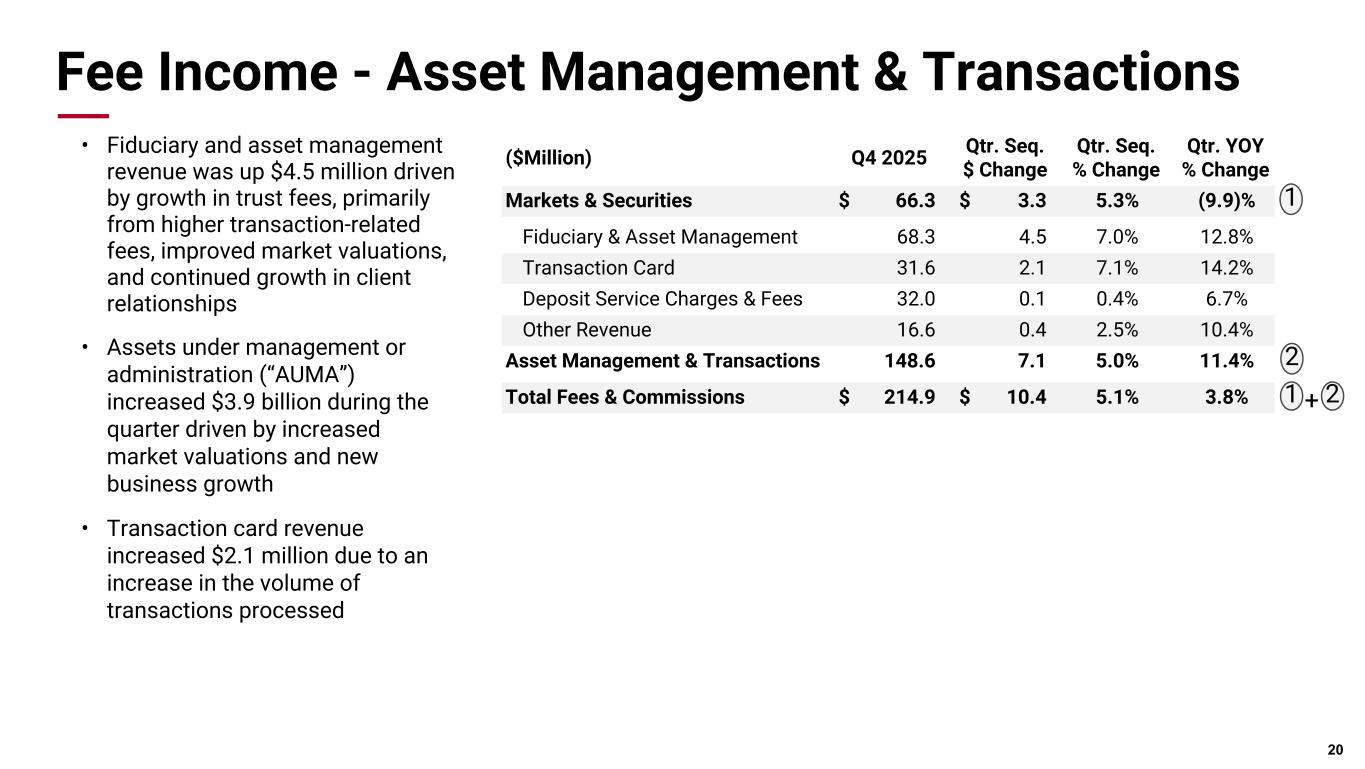 Pri m ar y & se co nd ar y br an d co lor s Data viz colors Data viz monochromatic Fee Income - Markets & Securities Trading Fees • Trading fee income increased $5.4 million driven by higher trading volumes for U.S. agency residential mortgage-backed securities Investment Banking Fees • Investment banking revenue, which includes investment banking fees and syndication fees, decreased $1.9 million with municipal underwriting activity returning to more normal levels following an exceptional third quarter, partially offset by growth in loan syndication fees 19 ($Million) Q4 2025 Qtr. Seq. $ Change Qtr. Seq. % Change Qtr. YOY % Change Trading Fees $ 20.9 $ 5.4 35.1% (36.7)% Mortgage Banking 19.0 (0.8) (3.8)% 4.8% Customer Hedging Fees 6.7 1.0 16.7% (7.6)% Brokerage Fees 5.4 (0.5) (8.1)% 9.4% Syndication Fees 6.5 2.2 52.7% 29.0% Investment Banking Fees 7.8 (4.1) (34.4)% 48.7% Markets & Securities $ 66.3 $ 3.3 5.3% (9.9)% ($Million) Q4 2025 Q3 2025 Q2 2025 Q1 2025 Q4 2024 Trading Fees $ 20.9 $ 15.5 $ 14.4 $ 8.1 $ 33.1 Trading NII* 13.2 14.3 16.1 15.2 4.6 Total Trading Revenue $ 34.1 $ 29.8 $ 30.5 $ 23.3 $ 37.7 A A Total Trading Revenue A + B B * Non-GAAP measure