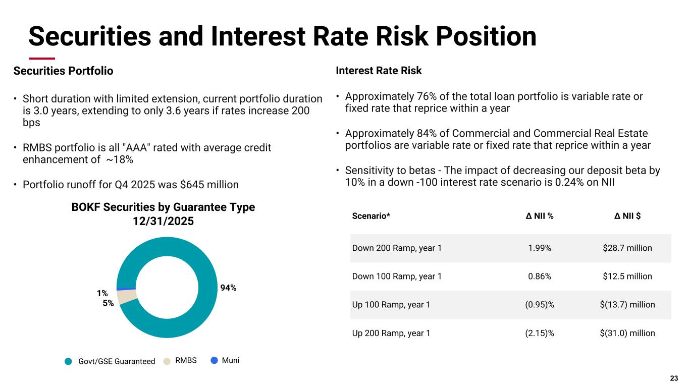 Pri m ar y & se co nd ar y br an d co lor s Data viz colors Data viz monochromatic Securities and Interest Rate Risk Position Interest Rate Risk • Approximately 76% of the total loan portfolio is variable rate or fixed rate that reprice within a year • Approximately 84% of Commercial and Commercial Real Estate portfolios are variable rate or fixed rate that reprice within a year • Sensitivity to betas - The impact of decreasing our deposit beta by 10% in a down -100 interest rate scenario is 0.24% on NII 23 Scenario* Δ NII % Δ NII $ Down 200 Ramp, year 1 1.99% $28.7 million Down 100 Ramp, year 1 0.86% $12.5 million Up 100 Ramp, year 1 (0.95)% $(13.7) million Up 200 Ramp, year 1 (2.15)% $(31.0) million Securities Portfolio • Short duration with limited extension, current portfolio duration is 3.0 years, extending to only 3.6 years if rates increase 200 bps • RMBS portfolio is all "AAA" rated with average credit enhancement of ~18% • Portfolio runoff for Q4 2025 was $645 million 94% 5% 1% Govt/GSE Guaranteed RMBS Muni BOKF Securities by Guarantee Type 12/31/2025