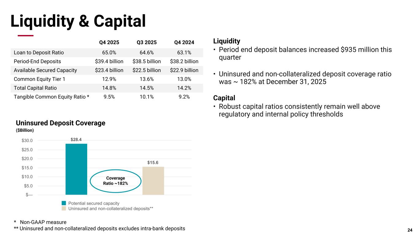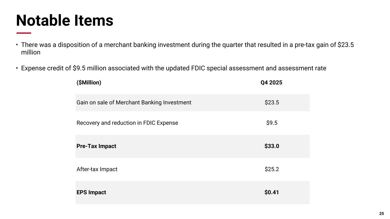 Pri m ar y & se co nd ar y br an d co lor s Data viz colors Data viz monochromatic Liquidity & Capital * Non-GAAP measure ** Uninsured and non-collateralized deposits excludes intra-bank deposits Liquidity • Period end deposit balances increased $935 million this quarter • Uninsured and non-collateralized deposit coverage ratio was ~ 182% at December 31, 2025 Capital • Robust capital ratios consistently remain well above regulatory and internal policy thresholds 24 Q4 2025 Q3 2025 Q4 2024 Loan to Deposit Ratio 65.0% 64.6% 63.1% Period-End Deposits $39.4 billion $38.5 billion $38.2 billion Available Secured Capacity $23.4 billion $22.5 billion $22.9 billion Common Equity Tier 1 12.9% 13.6% 13.0% Total Capital Ratio 14.8% 14.5% 14.2% Tangible Common Equity Ratio * 9.5% 10.1% 9.2% $28.4 $15.6 Potential secured capacity Uninsured and non-collateralized deposits** $— $5.0 $10.0 $15.0 $20.0 $25.0 $30.0 Coverage Ratio ~182% Uninsured Deposit Coverage ($Billion)