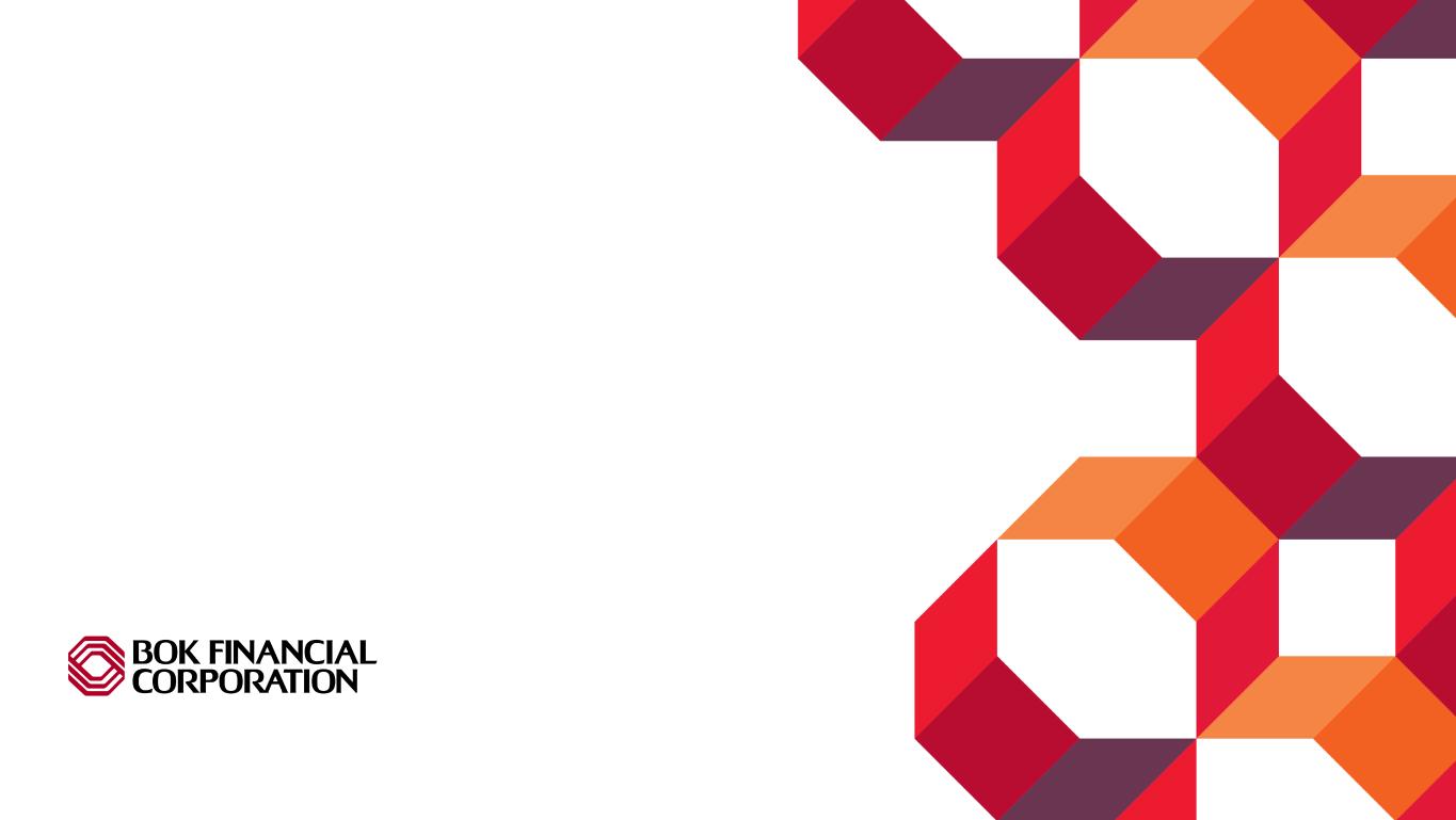 Pri m ar y & se co nd ar y br an d co lor s Data viz colors Data viz monochromatic Diversified Loan Portfolio Portfolio Composition as of 12/31/2025 76% 15% 7% Oil & Gas Producers Oil & Gas Midstream Services 10% 8% 82% Hospital Medical Services Senior Housing 43% 24% 14% 10% 2% 7% Multifamily Industrial Office Retail Residential Cons Other Energy Banking • More than 100-year history in energy lending • Focus on first-lien, senior-secured E&P lending, the "sweet spot" in energy lending • Seasoned internal petroleum engineering staff to confirm collateral values - a material investment that is a key to strong credit performance across the cycle • Minimal exposure to second liens, undeveloped reserves, or other higher-risk components of the capital stack • 50-60% loan to value on proven producing reserves Healthcare Banking • Favorable spreads • Predominately BOK Financial originated commitments • Senior housing commitments real-estate collateralized and secured • Favorable credit metrics Commercial Real Estate • Collateral focused in Texas (32%), Colorado (9%), Arizona (8%), Oklahoma (7%), New Mexico (6%) and Kansas/Missouri (3%) • Allocate 185% of Tier 1 capital plus reserves to CRE (ratio is currently 168%) • Further controls and limitations by product type and geography with concentration guidelines analyzed and adjusted quarterly, as needed • Strong relationship between the front-line production/bankers and credit concurrence officers • Minimal exposure to residential construction and land development (highest risk, most cyclical sector in CRE) $2.9 billion outstanding $4.0 billion outstanding $5.7 billion outstanding 6
