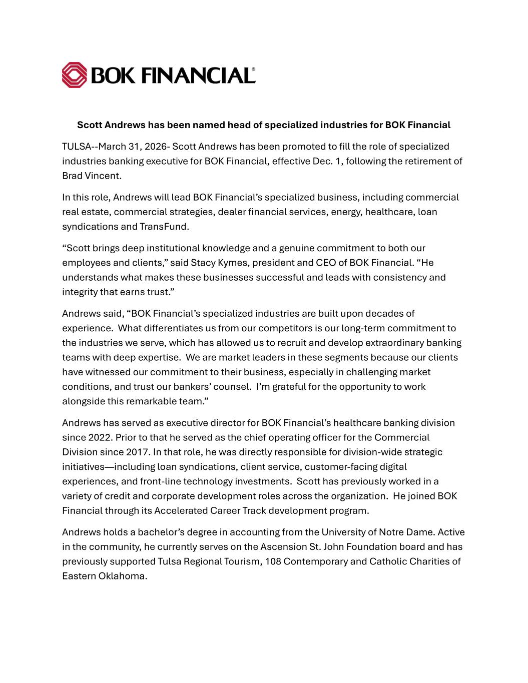 Scott Andrews has been named head of specialized industries for BOK Financial TULSA--March 31, 2026- Scott Andrews has been promoted to fill the role of specialized industries banking executive for BOK Financial, effective Dec. 1, following the retirement of Brad Vincent. In this role, Andrews will lead BOK Financial’s specialized business, including commercial real estate, commercial strategies, dealer financial services, energy, healthcare, loan syndications and TransFund. “Scott brings deep institutional knowledge and a genuine commitment to both our employees and clients,” said Stacy Kymes, president and CEO of BOK Financial. “He understands what makes these businesses successful and leads with consistency and integrity that earns trust.” Andrews said, “BOK Financial’s specialized industries are built upon decades of experience. What differentiates us from our competitors is our long-term commitment to the industries we serve, which has allowed us to recruit and develop extraordinary banking teams with deep expertise. We are market leaders in these segments because our clients have witnessed our commitment to their business, especially in challenging market conditions, and trust our bankers’ counsel. I’m grateful for the opportunity to work alongside this remarkable team.” Andrews has served as executive director for BOK Financial’s healthcare banking division since 2022. Prior to that he served as the chief operating officer for the Commercial Division since 2017. In that role, he was directly responsible for division-wide strategic initiatives—including loan syndications, client service, customer-facing digital experiences, and front-line technology investments. Scott has previously worked in a variety of credit and corporate development roles across the organization. He joined BOK Financial through its Accelerated Career Track development program. Andrews holds a bachelor’s degree in accounting from the University of Notre Dame. Active in the community, he currently serves on the Ascension St. John Foundation board and has previously supported Tulsa Regional Tourism, 108 Contemporary and Catholic Charities of Eastern Oklahoma.