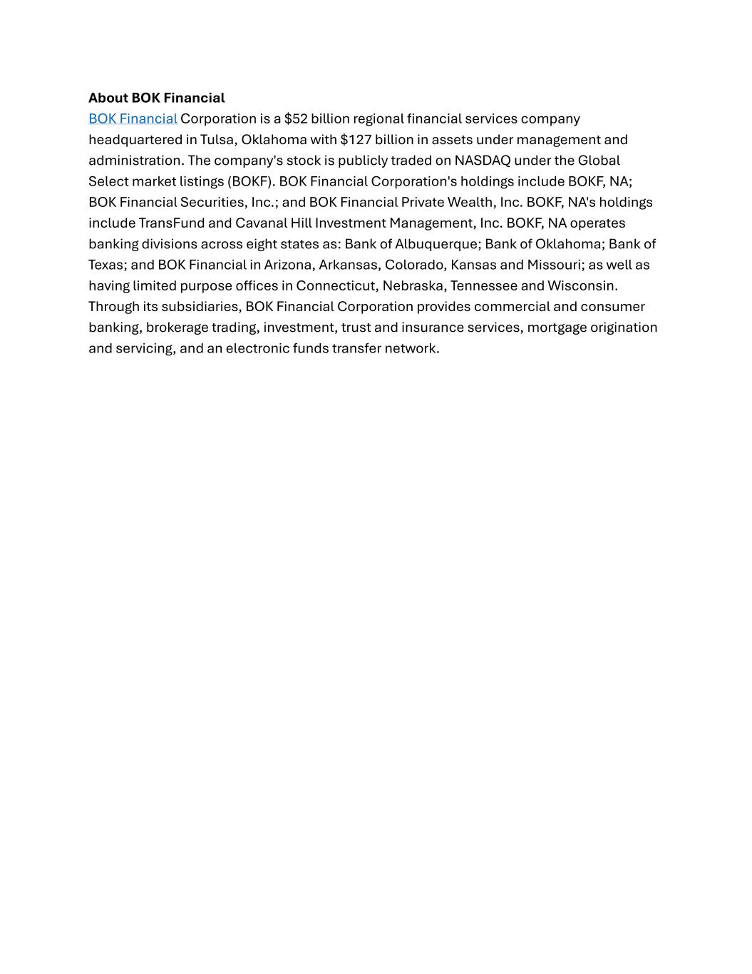 About BOK Financial BOK Financial Corporation is a $52 billion regional financial services company headquartered in Tulsa, Oklahoma with $127 billion in assets under management and administration. The company's stock is publicly traded on NASDAQ under the Global Select market listings (BOKF). BOK Financial Corporation's holdings include BOKF, NA; BOK Financial Securities, Inc.; and BOK Financial Private Wealth, Inc. BOKF, NA's holdings include TransFund and Cavanal Hill Investment Management, Inc. BOKF, NA operates banking divisions across eight states as: Bank of Albuquerque; Bank of Oklahoma; Bank of Texas; and BOK Financial in Arizona, Arkansas, Colorado, Kansas and Missouri; as well as having limited purpose offices in Connecticut, Nebraska, Tennessee and Wisconsin. Through its subsidiaries, BOK Financial Corporation provides commercial and consumer banking, brokerage trading, investment, trust and insurance services, mortgage origination and servicing, and an electronic funds transfer network.
