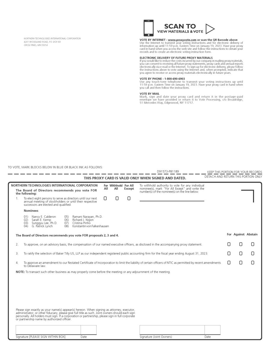D91574 - P81189 Important Notice Regarding the Availability of Proxy Materials for the Annual Meeting: The Combined Annual Report and Proxy Statement Document is available at www.proxyvote.com. This proxy is solicited by the Board of Directors NORTHERN TECHNOLOGIES INTERNATIONAL CORPORATION Annual Meeting of Stockholders January 20, 2023 The undersigned, having duly received the Notice of Annual Meeting of Stockholders and Proxy Statement, hereby appoints Richard J . Nigon, G . Patrick Lynch and Matthew C . Wolsfeld, or any of them, as proxies, each with the power to appoint his substitute, and hereby authorizes them to represent and to vote, as designated on the reverse side of this ballot, all of the shares of common stock of Northern Technologies International Corporation that the undersigned is entitled to vote at the Annual Meeting of Stockholders of Northern Technologies International Corporation, a Delaware corporation, to be held at Northern Technologies International Corporation Headquarters, 4201 Woodland Road, Circle Pines, Minnesota 55014 , beginning at 11 : 00 a . m . , local time, on Friday, January 20 , 2023 , for the purposes stated on the reverse side, and any adjournment or postponement thereof . WHEN PROPERLY EXECUTED, THIS PROXY WILL BE VOTED IN THE MANNER DIRECTED HEREIN BY THE UNDERSIGNED STOCKHOLDER . IF NO DIRECTION IS MADE, THE PROXY WILL BE VOTED FOR THE ELECTION OF ALL NOMINEES FOR DIRECTOR AND FOR THE APPROVAL OF PROPOSALS 2 , 3 AND 4 IN THE DISCRETION OF THE PROXY HOLDER ON OTHER MATTERS WHICH MAY PROPERLY COME BEFORE THE MEETING . Continued and to be signed on reverse side