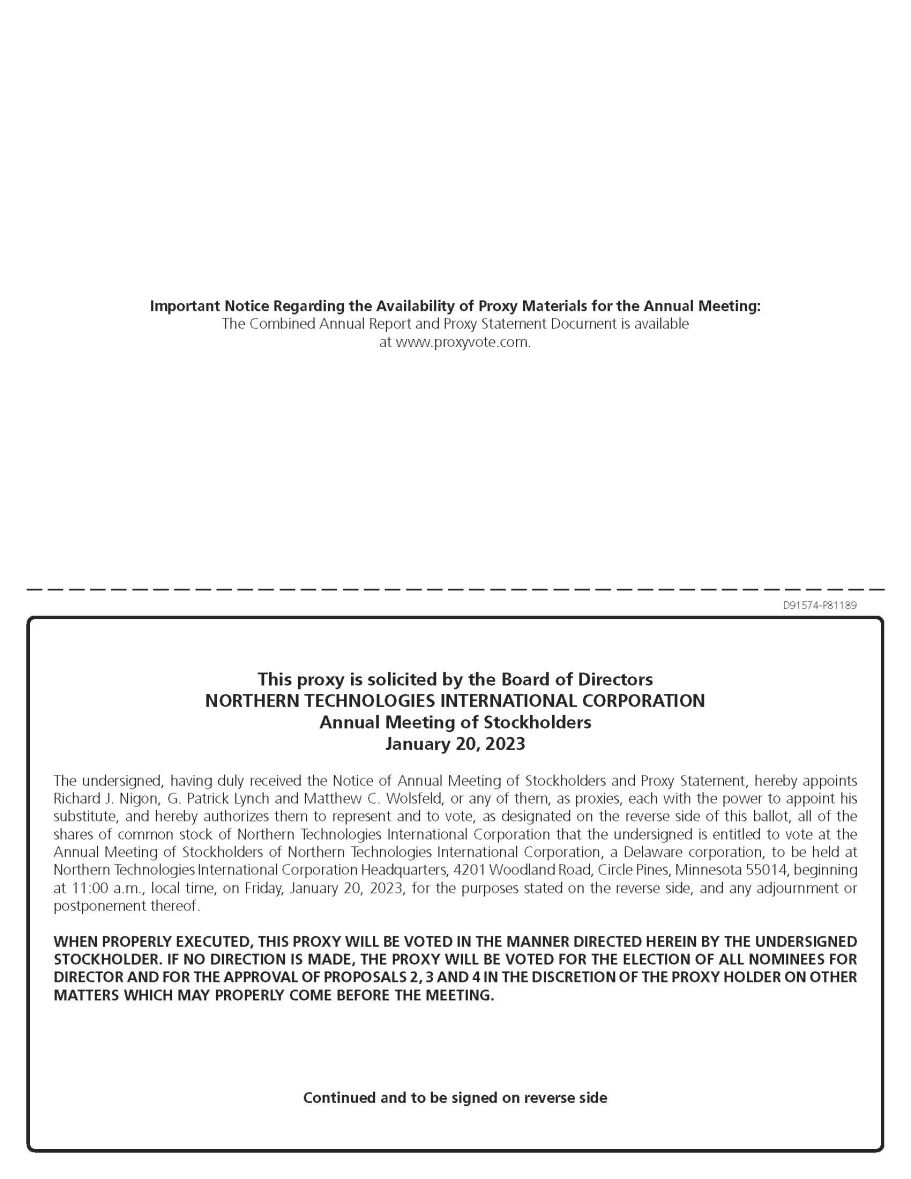 D91574 - P81189 Important Notice Regarding the Availability of Proxy Materials for the Annual Meeting: The Combined Annual Report and Proxy Statement Document is available at www.proxyvote.com. This proxy is solicited by the Board of Directors NORTHERN TECHNOLOGIES INTERNATIONAL CORPORATION Annual Meeting of Stockholders January 20, 2023 The undersigned, having duly received the Notice of Annual Meeting of Stockholders and Proxy Statement, hereby appoints Richard J . Nigon, G . Patrick Lynch and Matthew C . Wolsfeld, or any of them, as proxies, each with the power to appoint his substitute, and hereby authorizes them to represent and to vote, as designated on the reverse side of this ballot, all of the shares of common stock of Northern Technologies International Corporation that the undersigned is entitled to vote at the Annual Meeting of Stockholders of Northern Technologies International Corporation, a Delaware corporation, to be held at Northern Technologies International Corporation Headquarters, 4201 Woodland Road, Circle Pines, Minnesota 55014 , beginning at 11 : 00 a . m . , local time, on Friday, January 20 , 2023 , for the purposes stated on the reverse side, and any adjournment or postponement thereof . WHEN PROPERLY EXECUTED, THIS PROXY WILL BE VOTED IN THE MANNER DIRECTED HEREIN BY THE UNDERSIGNED STOCKHOLDER . IF NO DIRECTION IS MADE, THE PROXY WILL BE VOTED FOR THE ELECTION OF ALL NOMINEES FOR DIRECTOR AND FOR THE APPROVAL OF PROPOSALS 2 , 3 AND 4 IN THE DISCRETION OF THE PROXY HOLDER ON OTHER MATTERS WHICH MAY PROPERLY COME BEFORE THE MEETING . Continued and to be signed on reverse side